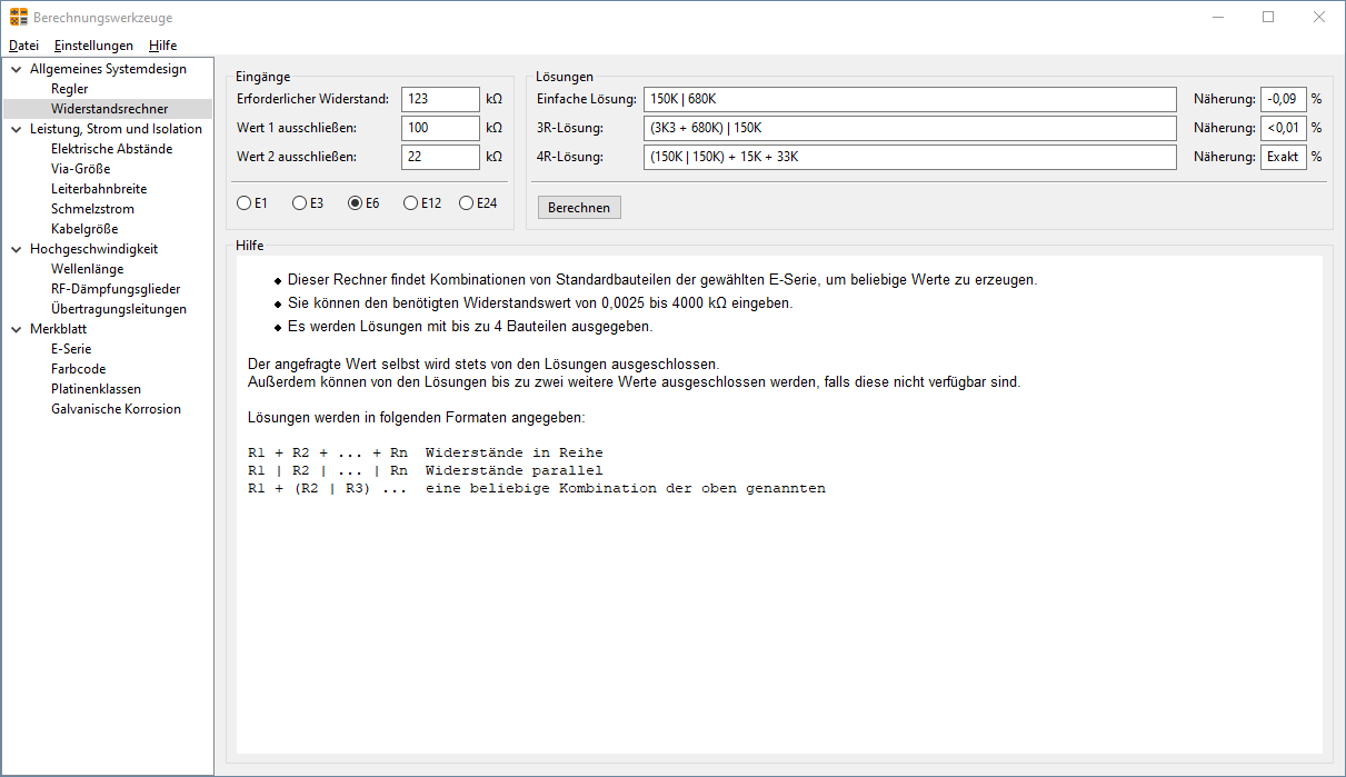 Ich nutze schon seit fast zwei Jahrzehnten ein kleines Tool dafür: Resistor CAD 2.0 by Terry Harris from Vader Systems. https://www.eevblog.com/2010/01/07/useful-resistor-calculation-tool/ Das 530kB kleine(!) Programm berechnet die Realisierung von Widerstandswerten als Serien- und Parallelschaltungen aus wählbaren E-Reihen. Die Ergebnisse werden als Liste nach prozentualem Fehler sortiert angezeigt. Für mich noch wichtiger ist die Möglichkeit, Spannungsteiler aus wählbaren E-Reihen zu berechnen. Man gibt das gewünschte Teilerverhältnis, sowie den minimalen und maximalen Innenwiderstand des Spannungsteilers an und bekommt wieder eine nach Fehler sortierte Liste von Widerstandspaaren. Nutze das ständig für die Berechnung der Spannungsteiler zum Festlegen der Ausgangsspannung von einstellbaren Spannungsreglern. Und nein, man muß dafür nicht immer exotische E96-Werte nutzen. Das Problem, einem Executable trauen zu müssen, bleibt.