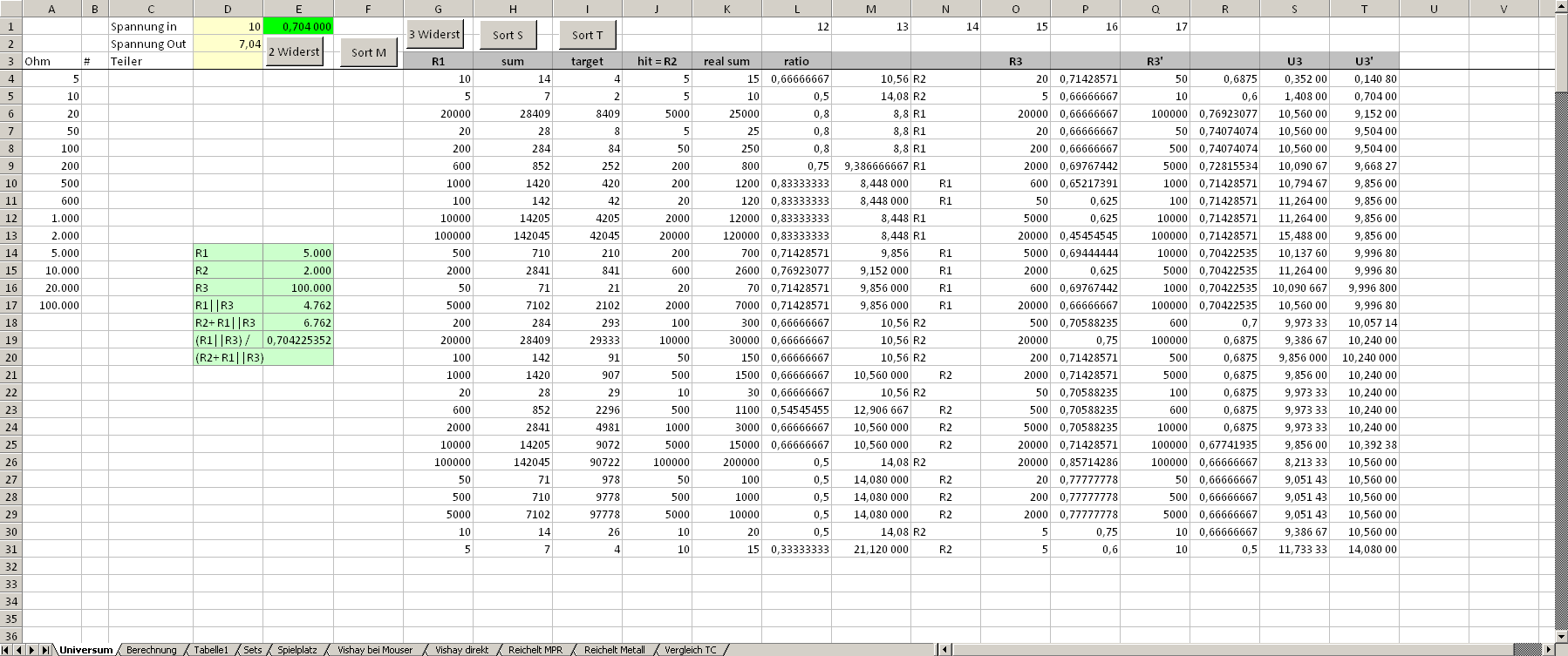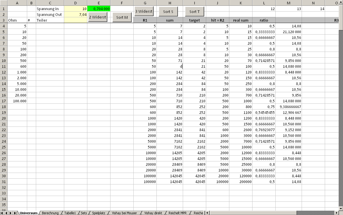 Hallo Gunnar F., Gunnar F. schrieb: > Leider > weiß ich nicht, wie das in Excel per Iteration ginge. dieser Diskussionsfaden vermischt die Berechnung von Spannungsteilern mit der Berechnung von Widerständen. Ich habe für mich in Excel ein Programm für die Berechnung von Spannungsteilern geschrieben. Den "Kot" (Freudsche Fehlleistung) will ich nicht rausrücken, erkläre aber gerne, wie ich es gelöst habe. Hintergrund war die Berechnung von Spannungsteilern für Spannungsreferenzen, also z.B. der Anhebung der Ausgangsspannung einer LM399 von ca 7 Volt auf 10 Volt. Hier geht's also um das private Umfeld, wo kein E96-Schrank zur Verfügung steht, sondern eher wenige Widerstände, dafür aber mit geringem TK. In Spalte A gibt man aufsteigend sortiert die vorhandenen Widerstände ein. Hier sind's Bürklin Drahtwiderstände mit TK10 von anno Tobak, deswegen ist die Auswahl hier so klein. Die Schaltfläche "2 Widerst" startet ein Makro, dass die Spalte A von oben nach unten durchläuft. und die Tabelle befüllt. Zu jedem Widerstand in Spalte A sucht das Makro die beiden Widerstände, die das gesuchte Teilerverhältnis am besten annähern. In Spalte L steht das Teilerverhältnis und in M (für OPV-Verstärkerschaltungen) die Ausgangsspannung, wenn mit dem angenäherten Teiler die 7,04 Volt verstärkt werden. Der Code hinter der Schaltfläche 3 Widerstände versucht, den vorhandenen Teiler durch Parallelschaltung zu verbessern. In hellgrüner Farbe habe ich nochmal beispielhaft aufgeführt, wie man das Verhältnis 0,704 aus den Widerständen mit 5000, 2000 und 100.000 Ohm annähert. Bei mir sind das ca. 250 Zeilen Makrocode, der aber auch unter Libre-Office laufen sollte, das ja mittlerweile Teile von VBA emuliert.