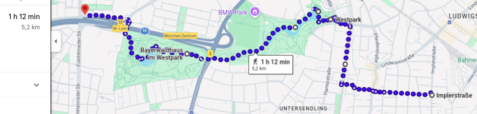 Dieter D. schrieb: > in dann durch den Westpark bis zur > Straßenbahnhaltestelle an der Fürstenrieder Straße gelaufen. Vom Balzer durch den Westpark zur Fürstenrieder? Tram? Also zur 18er, die zum Gondrellplatz fährt? Das ist ja geschätzt deutlich über 5 km. Die kürzeste Verbindung vom Hbf, also fast Balzer zur Fürstenrieder (Ecke Agnes-Bernauer) war einige Jahre mein Arbeitsweg. Oft mit dem Fahrrad.