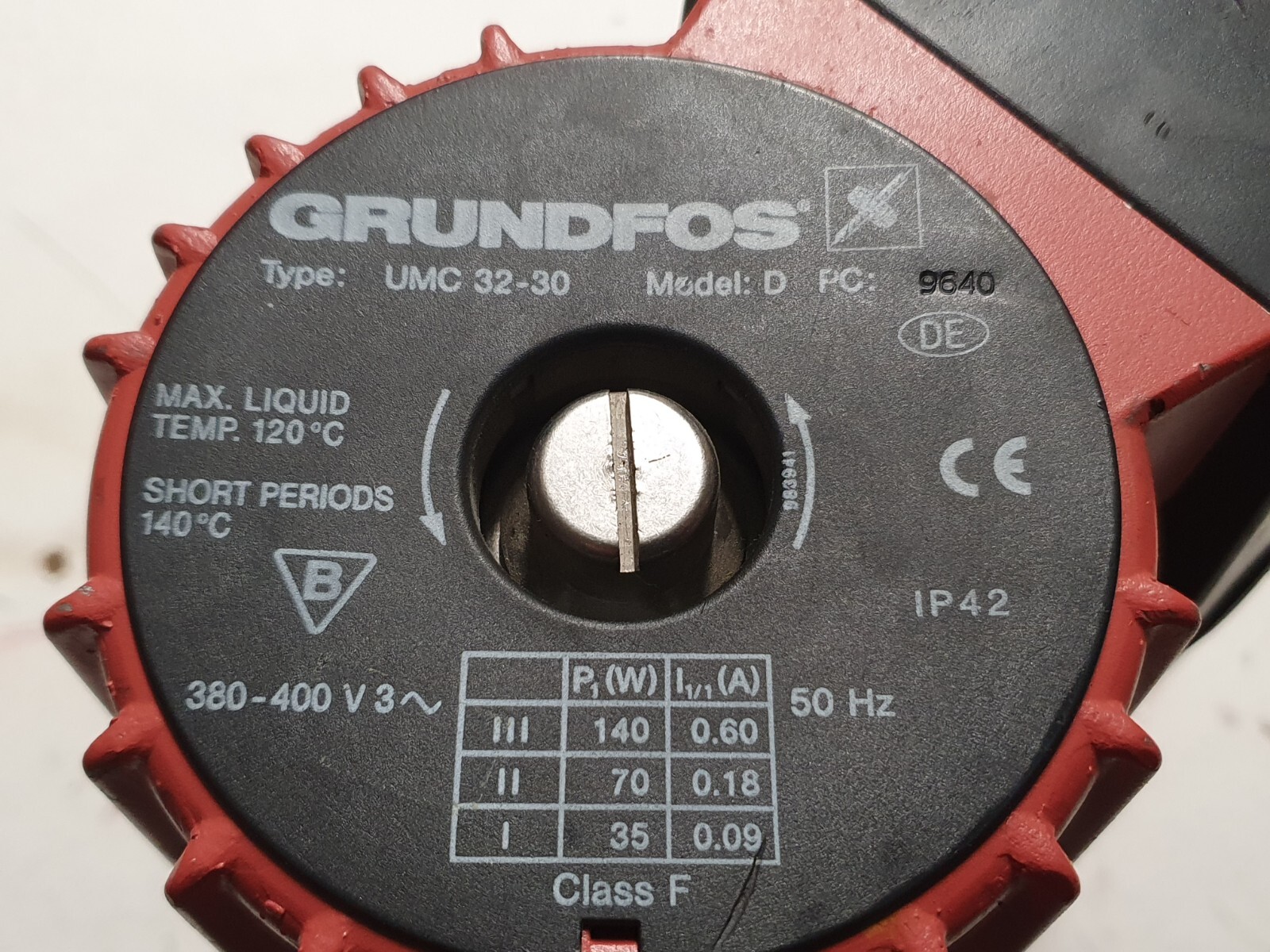 https://www.hosbv.com/de/product/productsheet/13033/Grundfos-UMC-32-30%20-%20productsheet.pdf Fotos der Pumpe und Kurzdaten "3 Geschwindigkeiten – 840/1430 U/min" (wo ist die dritte oder ist die Null?) "0,04/0,14 kW – 50Hz" "Leistung max. (kW) 0,1" (0,14 > 0,1 ?) noch eine Fundstelle: https://wilo.com/de/de/Fachhandwerker/Tools-Downloads/Austauschspiegel/de/grundfos/grundfos-umc/umc-32-30-3 "Phasen 3 Netzanschluss 3~400 V, 50 Hz (o die wirklich schon mit 3V anläuft?) Anschluss Eingang DN 32 Nenndruckanschluss saugseitig PN 6/10 Anschluss Ausgang DN 32 Nenndruckanschluss druckseitig PN 6/10" Alles etwas unpräzise. https://i.ebayimg.com/images/g/3tsAAOSwNvBllFi8/s-l1600.jpg Foto der Stirnseite mit Daten, immerhin drei Geschwindigkeiten angegeben 35/70/140Watt https://i.ebayimg.com/images/g/K1QAAeSwMbtn5BLM/s-l1600.jpg da steht noch 4µF