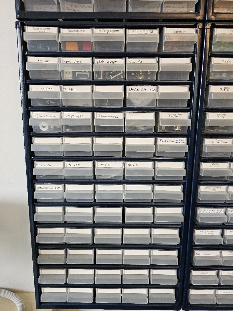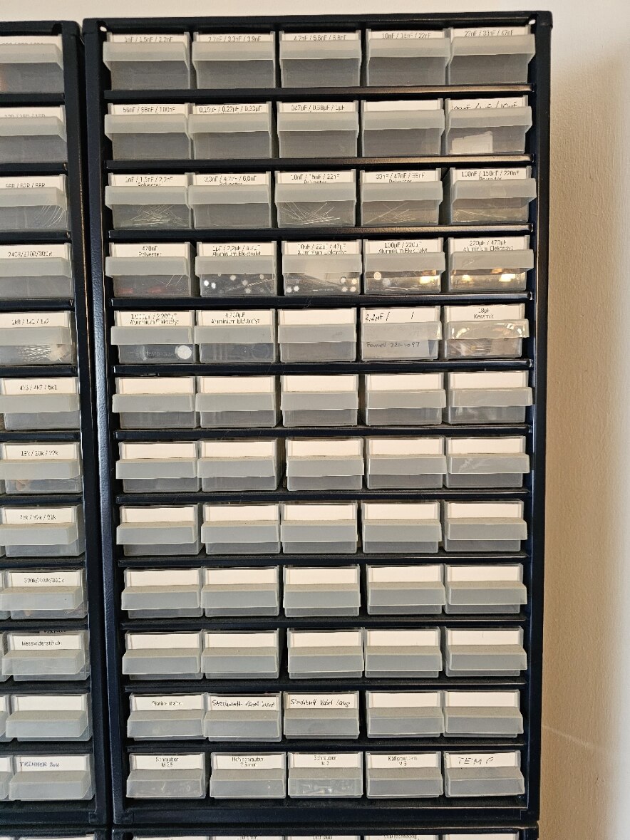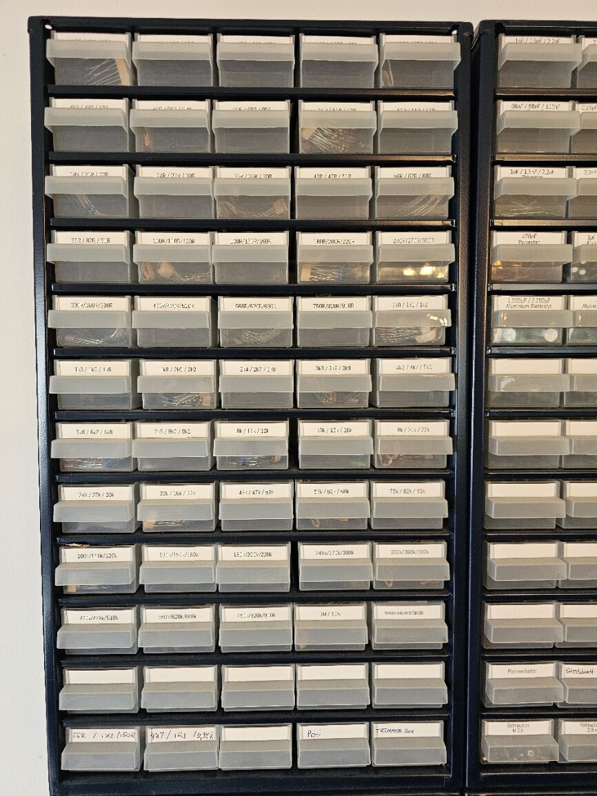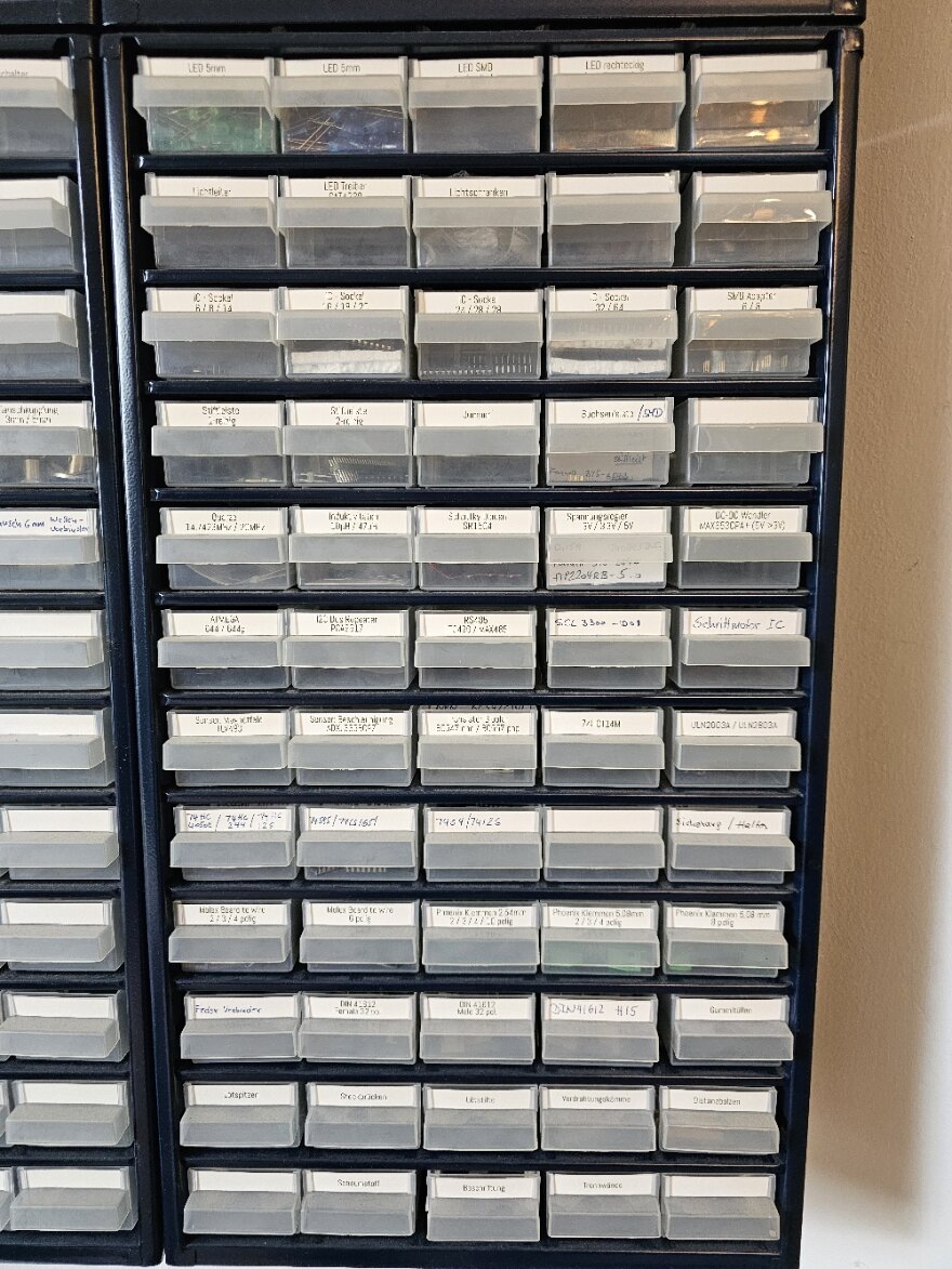Wegen der Laborauflösung stehen nun vier Magazine mit Bausteilen zum Abholen bereit. Nachdem der Inhalt schwer zu schätzen ist, hab ich mir die Mühe gemacht, von allen Bauteile online die Preise zu holen (in den Einschubfächern ist bei den Bauteilen jeweils der Lieferant mit Bestellnummer versehen). Anbei die entstandene Aufstellung. Es sind vier Kästen mit jeweils 60 Einschüben. Es sind insgesamt 4.548 Bauteile mit einem aktuellen Wert von € 2.088,67. Für € 500,- Nur Abholung (Raum Nürnberg). Ich lege noch Widerstands- und Kondensator-Sortiment drauf und Mira Boxen für SMD Bauteile (die sind auch teilweisen in den Kästen, um bedrahtete und SMD Bauteile sauber zu trennen, Bsp. Photo anbei).