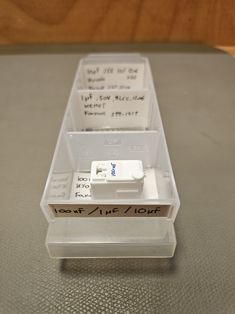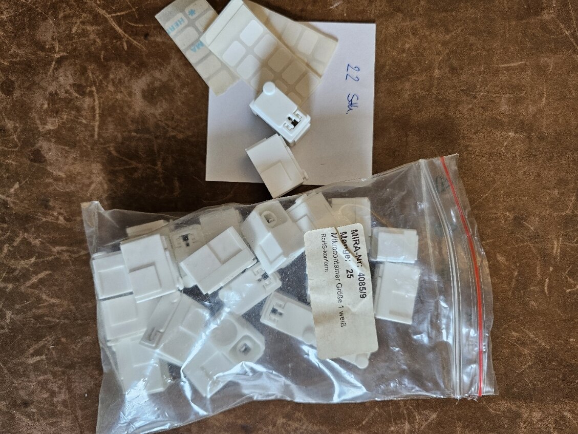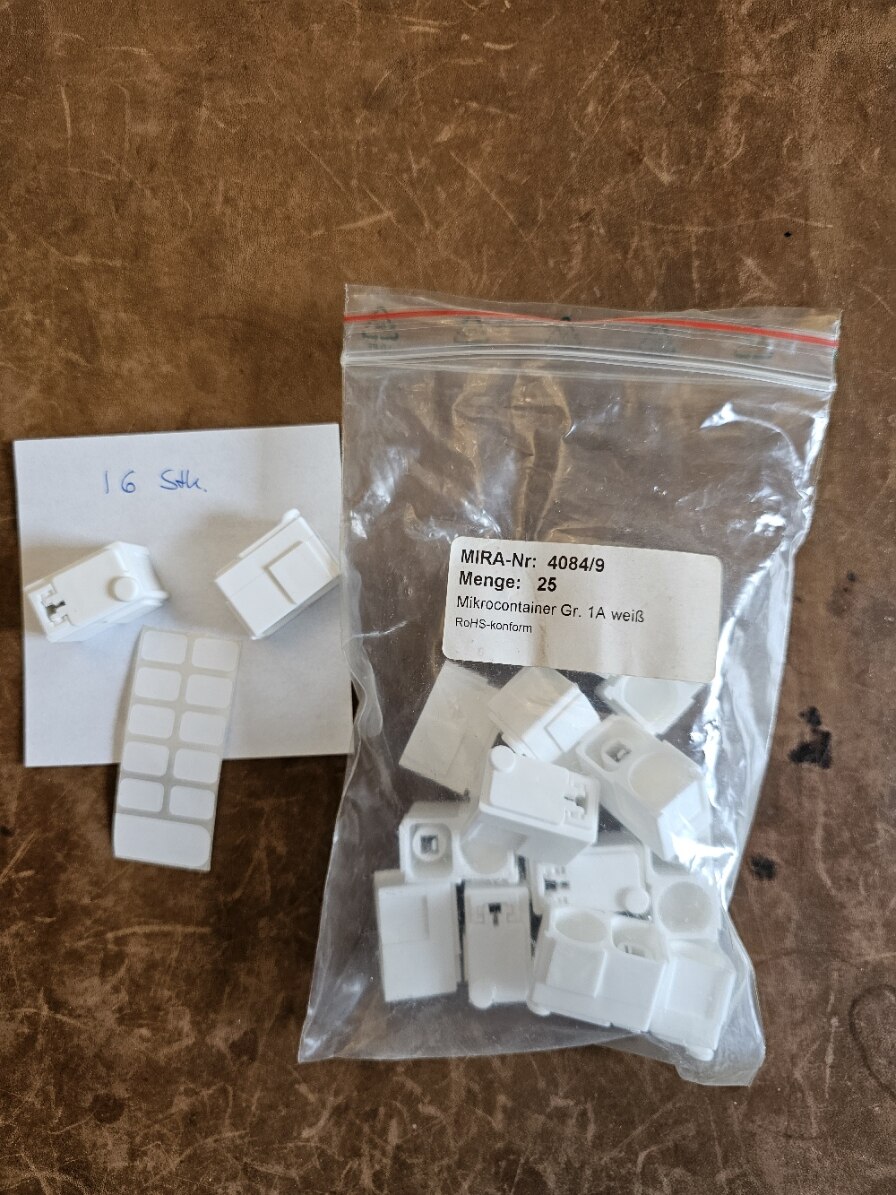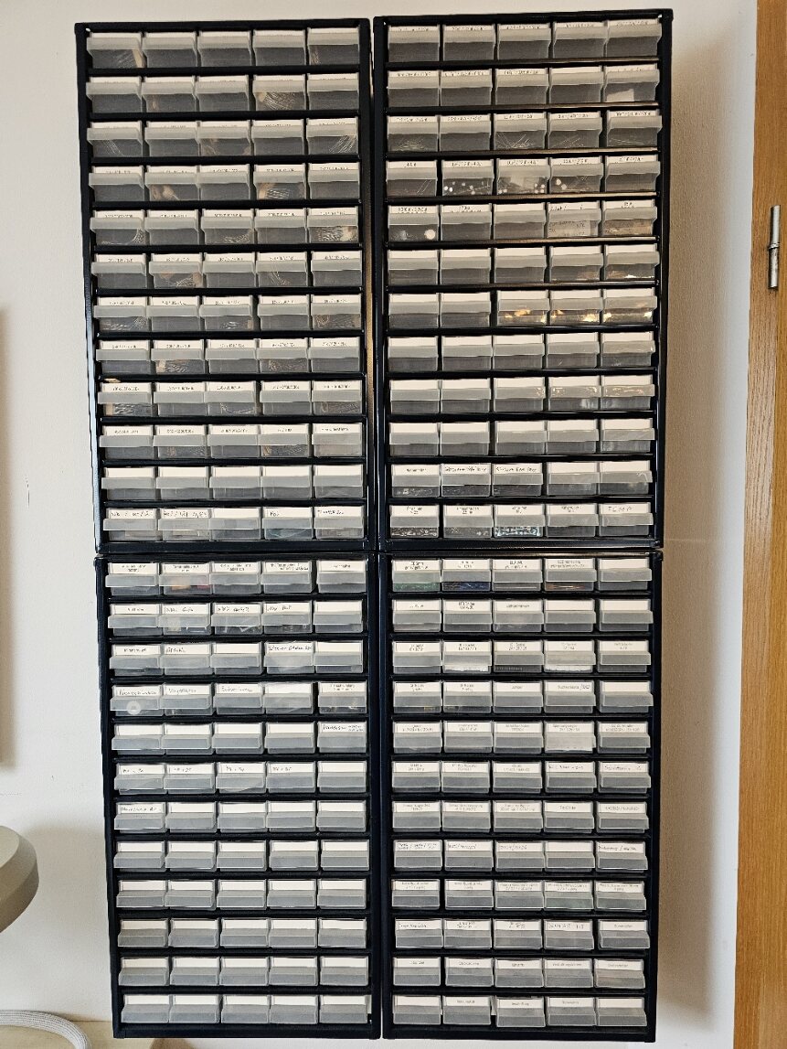 Wegen der Laborauflösung stehen nun vier Magazine mit Bausteilen zum Abholen bereit. Nachdem der Inhalt schwer zu schätzen ist, hab ich mir die Mühe gemacht, von allen Bauteile online die Preise zu holen (in den Einschubfächern ist bei den Bauteilen jeweils der Lieferant mit Bestellnummer versehen). Anbei die entstandene Aufstellung. Es sind vier Kästen mit jeweils 60 Einschüben. Es sind insgesamt 4.548 Bauteile mit einem aktuellen Wert von € 2.088,67. Für € 500,- Nur Abholung (Raum Nürnberg). Ich lege noch Widerstands- und Kondensator-Sortiment drauf und Mira Boxen für SMD Bauteile (die sind auch teilweisen in den Kästen, um bedrahtete und SMD Bauteile sauber zu trennen, Bsp. Photo anbei).