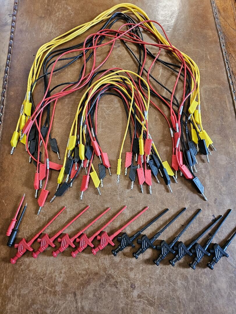 Wie auf dem Bild zu sehen, 1m und 0,25m Messtrippen, Hirschmann Klemmen und zwei Prüfspitzen. Aktueller Wert ca. € 150,- Für € 50,- + Versandt, oder hier abholen (Raum Nürnberg).