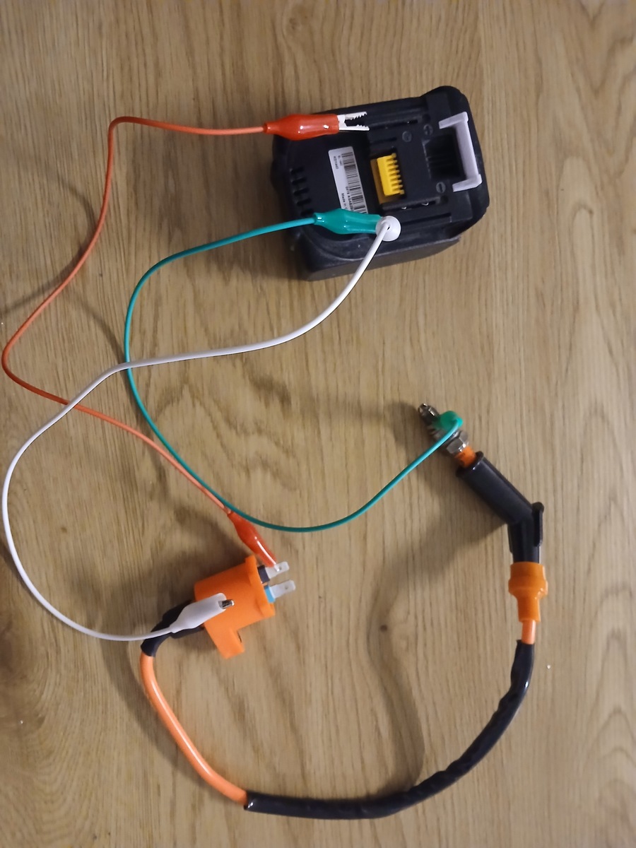 Hallo, Ich versuche einen Aufbau damit ich die Zündkerze auf mit einem Akku testen kann. Der Bohrmaschinenakku hat 14 Volt und war damit perfekt. Leider komme ich nicht zum Ziel. Minus verbinde ich mit dem Gewinde der Kerze und Plus mit dem schwarzen Flachstecker. Mit einem zweiten Kabel von Minus Kratze ich dann am grünen Flachstecker. Am Foto anbei habe ich das Nachgestellt (nicht wirklich angeschlossen) zur Illustrationen. Ich habe jetzt einige Varianten probiert wie Lampe dazwischen um die Ampere zu begrenzen, andere Spule, Starthilfekabel für Rückfluss von Gewinde zu Akku aber leider funktioniert es nicht. Was habe ich übersehen? Lg