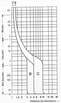 Also so weit ich weiß lösen die LS-schalter mit b und c charakteristik ab einem 3 bis 5fachen sofort aus. Ab einem Überstrom von 13% darf der schalter erst nach frühestens einer stunde auslösen. Solche bereiche sollten jedoch gemieden werden und schon gleich bei der Planung ausgeschlossen werden.
