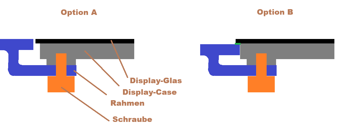 Bedenke, dass die Glaskanten des Touchscreens bei Variante B bezüglich Glasbruch besonders gefährdet sind.
