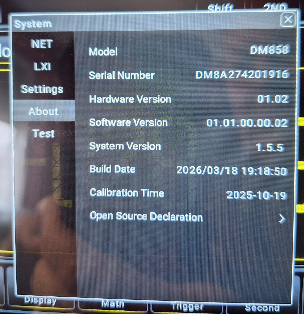 Muss da noch was richtig stellen weil man durch die Versionsangaben schnell verwirrt wird. Ausgeliefert wird mit V0.1.0.0.22. Rigol hat mir aber V1.1.0.0.2 geschickt, siehe Bilder. Am rumhuepfen der Messwertausgabe aendert sich dadurch aber erstmal nix. Dafuer hab ich jetzt aber eine Firmware vom 18.3.2026. :-D Vanye