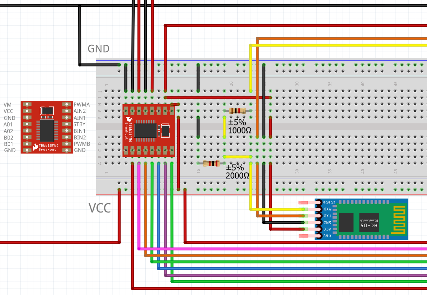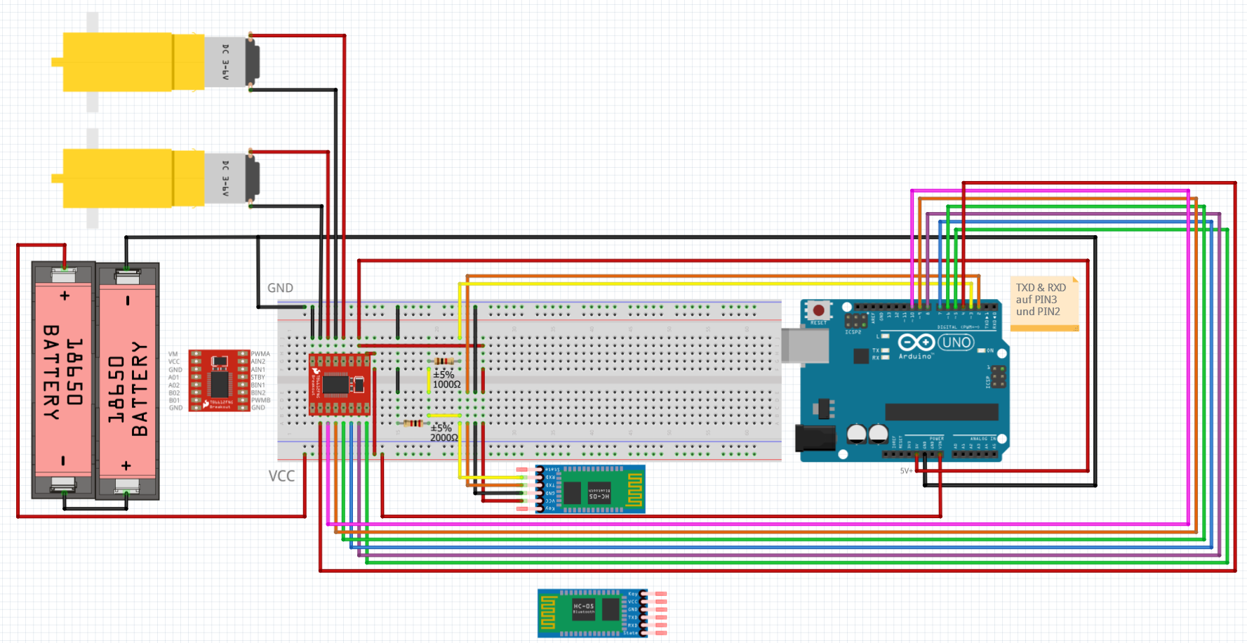 Hallo zusammen, Ich baue ein kleines RC-Car mit: Arduino Uno TB6612FNG Motortreiber 2 DC-Motoren HC-05 Bluetooth-Modul 2× 18650-Akkus in Serie Ziel ist: die Motoren über den TB6612FNG anzusteuern den Arduino per Akku zu versorgen den HC-05 zur Bluetooth-Steuerung zu benutzen Ich möchte 2× 18650 in Serie verwenden, also: Nennspannung: 7,4 V voll geladen: 8,4 V Meine Idee war: Arduino soll daraus 5 V Versorgung für Logik/Module bereitstellen TB6612FNG soll die Motoren treiben HC-05 soll mit eingebunden werden Arduino-Versorgung Ich möchte wissen, ob ich die 7,4–8,4 V aus 2×18650 sauber so einspeisen kann: über VIN / Barrel Jack (ehrlich gesagt, derzeit gerade präferierter) oder ob ein Step-Down-Wandler auf 5V die bessere Lösung ist HC-05 Pegelproblem Ich nutze ein HC-05-Bluetooth-Modul. VCC vom HC-05 an 5 V RX-Pin vom HC-05 braucht 3,3 V Logik Arduino Uno arbeitet aber mit 5 V Logik Deshalb habe ich für Arduino TX -> HC-05 RX einen Spannungsteiler mit 1 k Ohm und 2 k Ohm Widerständen vorgesehen. Ich möchte wissen, ob das so korrekt ist. TB6612FNG Versorgung VM = Motorspannung direkt vom Akku VCC = 5V Logikversorgung GND gemeinsam mit Arduino und HC-05 Ich möchte sicherstellen, dass die Trennung von Motorversorgung und Logikversorgung so korrekt ist. konkrete Fragen: Arduino besser über VIN oder besser per Step-Down-Regler auf 5 V versorgen? Ist der 1k/2k-Spannungsteiler für HC-05 RX so korrekt? Ist die Trennung von Motorversorgung (VM) und Logikversorgung (VCC) beim TB6612FNG so richtig? Seht ihr noch kritische Fehler in dem Aufbau? Ich bin dankbar für jede Info die euch einfällt, habt aber bitte etwas Nachsicht, ich fang gerade erst mit dem Hobby an ^^