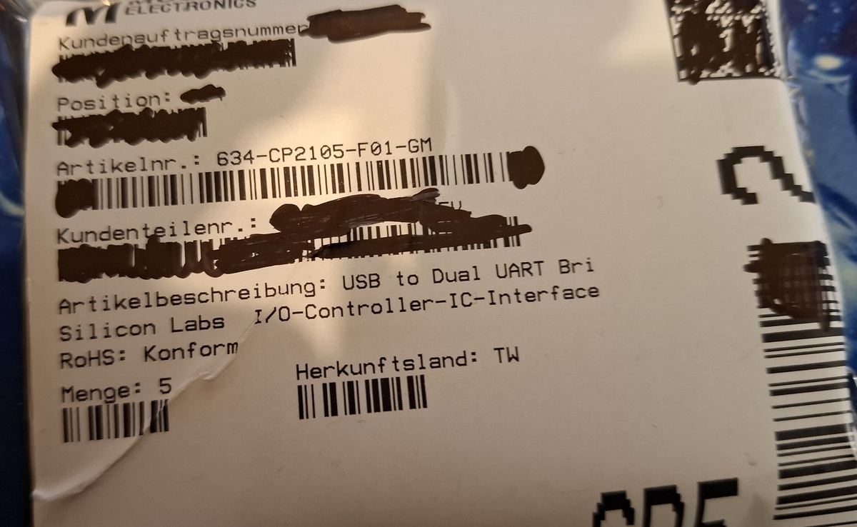 Hallo, Noch 5 Stück neue orginalverpackte Silabs CP2105-F01-GM Dual USB-to-UART bridge controllers. QFN24 Gehäuse (mit Sicherheit keine China Fakes! :-) https://www.mouser.de/ProductDetail/Silicon-Labs/CP2105-F01-GM?qs=j12q4iUN963tgVnLBX4aNA%3D%3D Alle für 9€ + 1,10€ Kompakt Brief (Versand DHL/Post und Paypal) Bei Interesse bitte PM mit Artikelangabe. Danke! MFG Roger