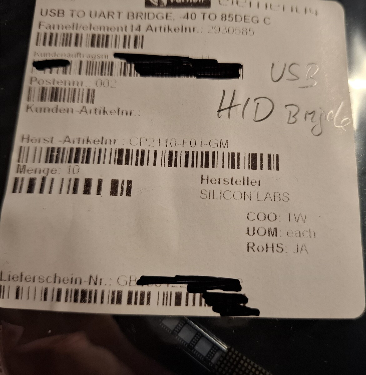 Hallo, noch 10 neue Orginalverpackte Silabs Bausteine. Silabs CP2110-F01-GM QFN24, 4 x 4 mm, Siehe Bild Single-Chip HID USB to UART Data Transfer also seriell RX/TX wird als Windows HID erkannt. ALso z.B direkt in eine Textdatei eingeben. https://www.mouser.de/ProductDetail/Silicon-Labs/CP2110-F01-GM?qs=j12q4iUN960yL%2FAK09Hgyg%3D%3D 8€ + 1,10€ Kompaktbrief (Versand DHL/Post und Paypal) Bei Interesse bitte PM mit Artikelangabe. Danke! MFG Roger