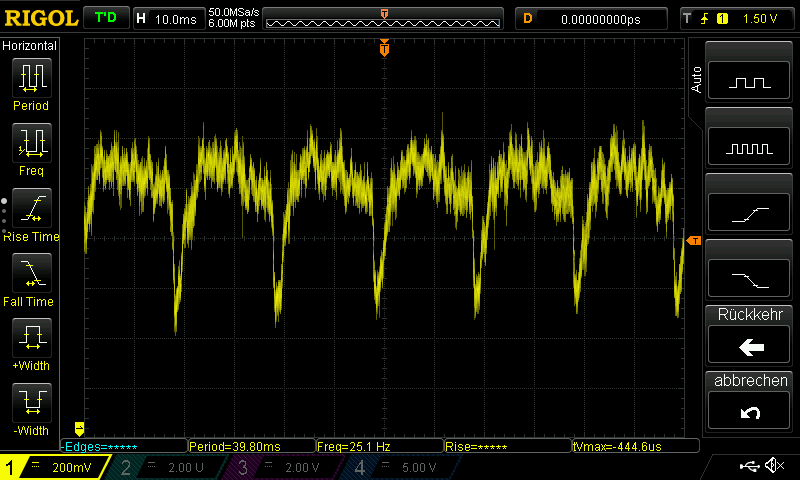 Stefan R. schrieb: > Wenn du vom Gleichrichter aus dem Plus folgst: > C168, (C166?), C158. Danke für den Tipp ... dann gehe ich das mal so durch. Gleich beim C168 wird es spannend => siehe Oszi Aufnahme. Dabei waren Masse/Tastkopf bei den nächst gelegenen, bedrahteten Bauteilen angebracht. Sollte also halbwegs richtig gemessen sein :) Ich meine mal, dass C168 wohl auch am Ende seiner Lebensdauer ist: - die Spannung ist unbelastet bei etwa 14,6V - Da die Uhrzeit nicht eingestellt ist, blinken die 4 Siebensegmentanzeigen im Sekunden rythmus. Das erzeugt die Belastung welche man sehr gut sehen kann: - da geht die Spannung um 1,7V runter und 50 Hz ripple geht in den 500mV Bereich Also ich glaub den kann ich gleich mal tauschen ... ausser hier erklärt mir jemand, dass das so sein sollte ... :)