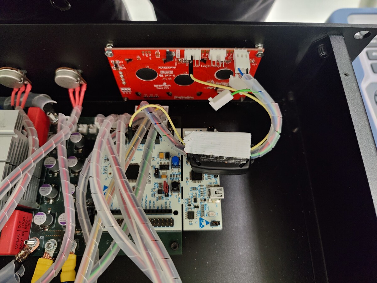 Guten Tag. Das Bild zeigt das innere eines Gerätes zur Erzeugung von Hochspannung, natürlich nur ein Ausschnitt. Dieser LCD von Sparcfun mit 20x4 Zeichen ist das Problem. Die Vom Gerät erzeugt Hochspannung erzeugt Entladungen, welche als Nadelimpulse überall herumschmutzen. Der Hochspannungstransformator lebst liegt zwar außerhalb des Gehäuses, aber via Kabel kommt der Schmutz trotzdem rein. Was funktioniert ist der Controller auf dem nucleo-Board. Auch die Datenübertragung von diesem zur Display-Platine geht inzwischen fehlerfrei (mittels Testsoftware überprüft) (die machte auch Probleme, aber mit UART und Push-Pull-Ausgängen anstatt Pullup ging es dann). Der Display stürzt aber dennoch gelegentlich ab. Bootet neu oder hängt sich komplett auf. Ich habe versucht, mit Nahfeldsonden die Quelle zu finden, bringt aber keinerlei Erkenntnisse. Störsignale überall im E-Feld. Die M-Feldsonde zeigt nichts, zumindest nichts, was von der Amplitude reichen könnte, einen Microcontroller abstürzen zu lassen. Auch drehen an der E-Feld-Sonde bringt keine Erkenntnisse, man kann den Störungen keine Richtung zuordnen. Ein einfaches Schirmungsblech parallel zur Display-Platine bringt auch nichts - wenn dieses Blech derzeit auch nur da ist und nirgendwo angeschlossen ist. Wenn ich wüsste, dass es sich lohnte, würde ich ja Befestigungslöcher in die Frontplatte bohren. Aber eine These, bitte korrigieren, falls falsch: Das Blech parallel zur Platine sollte E-Felder in der Ebene der Platine verhindern, selbst wenn dieses Blech nicht angeschlossen ist. E-Felder senkrecht zur Platine dürfte die Elektronik jedoch nicht stören. Magnetfelder senkrecht zur Platine konnte ich nicht messen und würden von diesem Blech ebenfalls via Wirbelströmen unterdrückt werden. Um das Kabel (9V, GND, Data) ist ein Klappferrit drum. Die Displayplatine ist nicht unbedingt sicher elektrisch mit der Frontplatte verbunden. Bemerkenswert ist ja, das auf der Displayplatine sehr wohl die üblichen 100nF-Stützkondensatoren verbaut sind. Wie kann ein Nadelimpuls - der mit der Feldsonde nur einen Betrag von 200mV erzeugt - einen Black- oder Brownout bewirken? Da das nucleo-Board ja problemlos läuft, würde ich sagen, ich bräuchte einen anderen Display mit 4-Layer-Platine. Kennt jemand so etwas? Oder würde es sich doch lohnen, einen Blechkäfig um die Display-Platine herum zu bauen, welcher wirklich leitfähig mit der Frontplatte verbunden ist? Dann sind der Display selbst und die Kabel aber immer noch Löcher im Faradyschen Käfig. Wie gesagt, ein anderer robusterer Display wäre schön, einer bei dem die Platine durchgehende Kupferfläche hat. Aber ich kann leider keinen finden. Es gibt zwar Alternativen, aber nichts mit hilfreichen Angaben bezüglich EMI-Festigkeit. Ach ja, mit Ferriten die Störungen draußen halten, dürfte kaum erfolgreich sein. Da bräuchte ich Ferrite, welche bei 100MHz Impedanzen im 6-stelligen Bereich haben müssten, Störsignalquelle ist schließlich die Entladung einer Kapazität mit 1pF bei 20kV in etwa 10ns. Dagegen sind die 100V/A von so einem Ferrit eher lächerlich. Puh, ich wollte mich eigentlich kürzer fassen:-) Besten Dank, Güße, Roland Damm