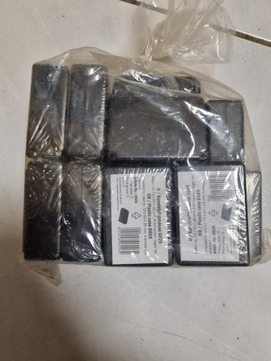 Hallo Zusammen, verkaufe hier - 16x Kunststoffgehäuse G026 72x50x28mm mit 4 Schrauben. Neu und OVP (Die Tüte außenrum ist etwas staubig, die Gehäuse sind jeweils nochmal extra eingeschweißt) 10€ plus Versand