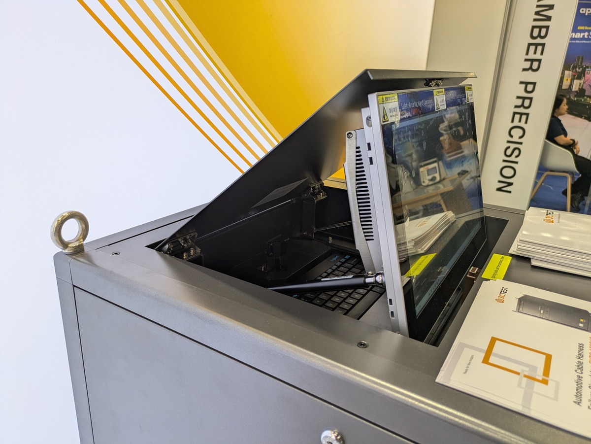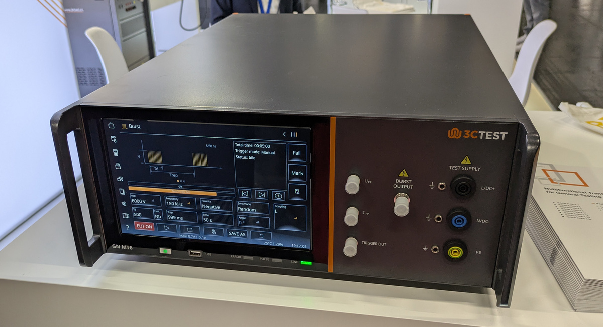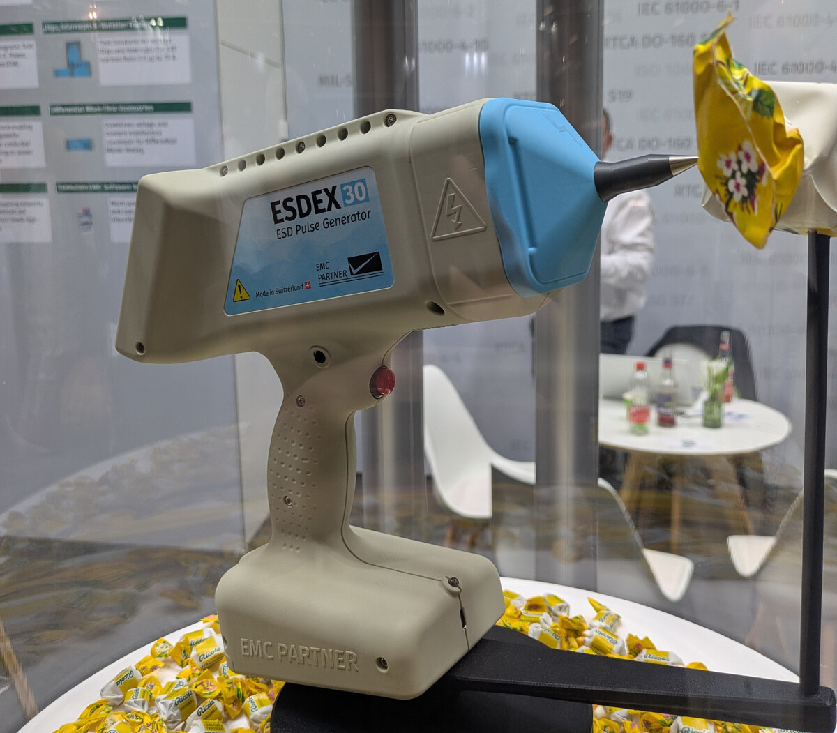 Die Weiterentwicklung von Echtzeitbetriebssystem, Mikrocontroller und Co führt dazu, dass mittlerweile auch ESD-Pistolen durch die Bank Touchscreens mitbringen. Die von EMC PARTNER gezeigte Version bringt nicht nur einen kapazitiven Touchscreen mit, sondern lässt sich per USB-C binnen 80 Minuten aufladen.