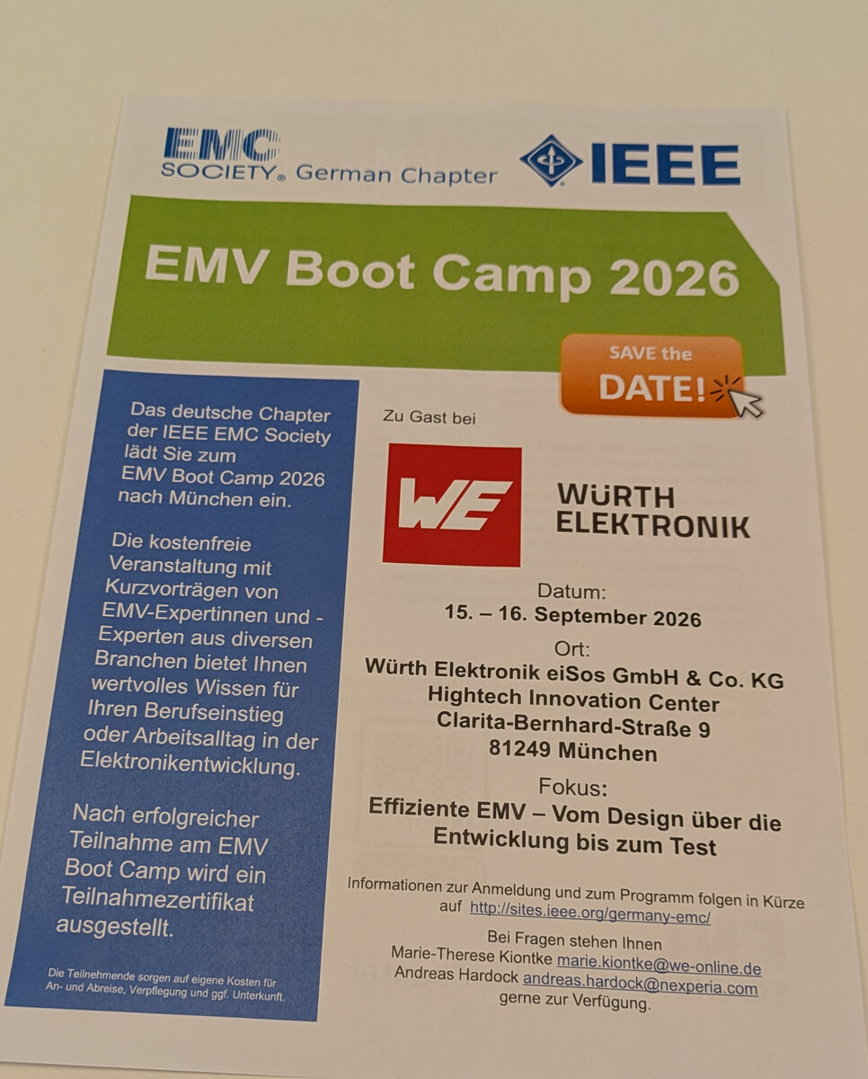 In Zusammenarbeit mit Würth Elektronik gibt es im September eine EMV-Schulung. Weitere Informationen finden sich im abgebildeten Flyer.
