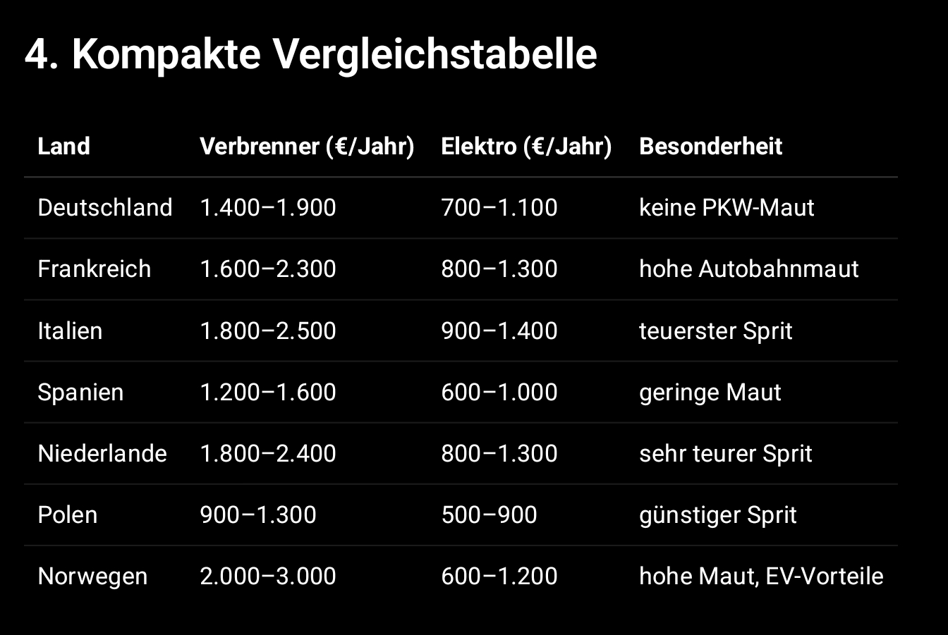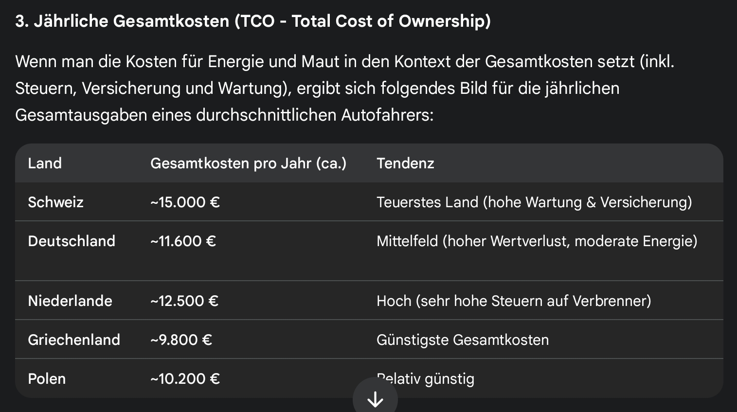 Laufende KFZ Kosten in Europa, gemäss KI. Ohne (ChatGPT) und mit Steuern, Versicherung und Wartung (Gemini).