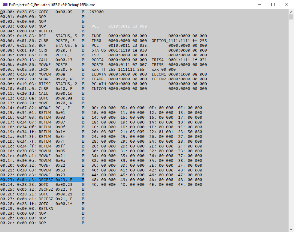 Vor paar Wochen habe ich angefangen einen Emulator für den Microchip PIC16F84 zu schreiben. Nach 5 Wochenenden, kann es alle Isntrukctionen dekodieren, dissasemblierten Code anzeigen und alle Instruktionen bis auf ClearWatchdog und Sleep ausführen. Interrupts funktioneren noch nicht, der nächste Schritt wird vermutlich Timer 0 sein.