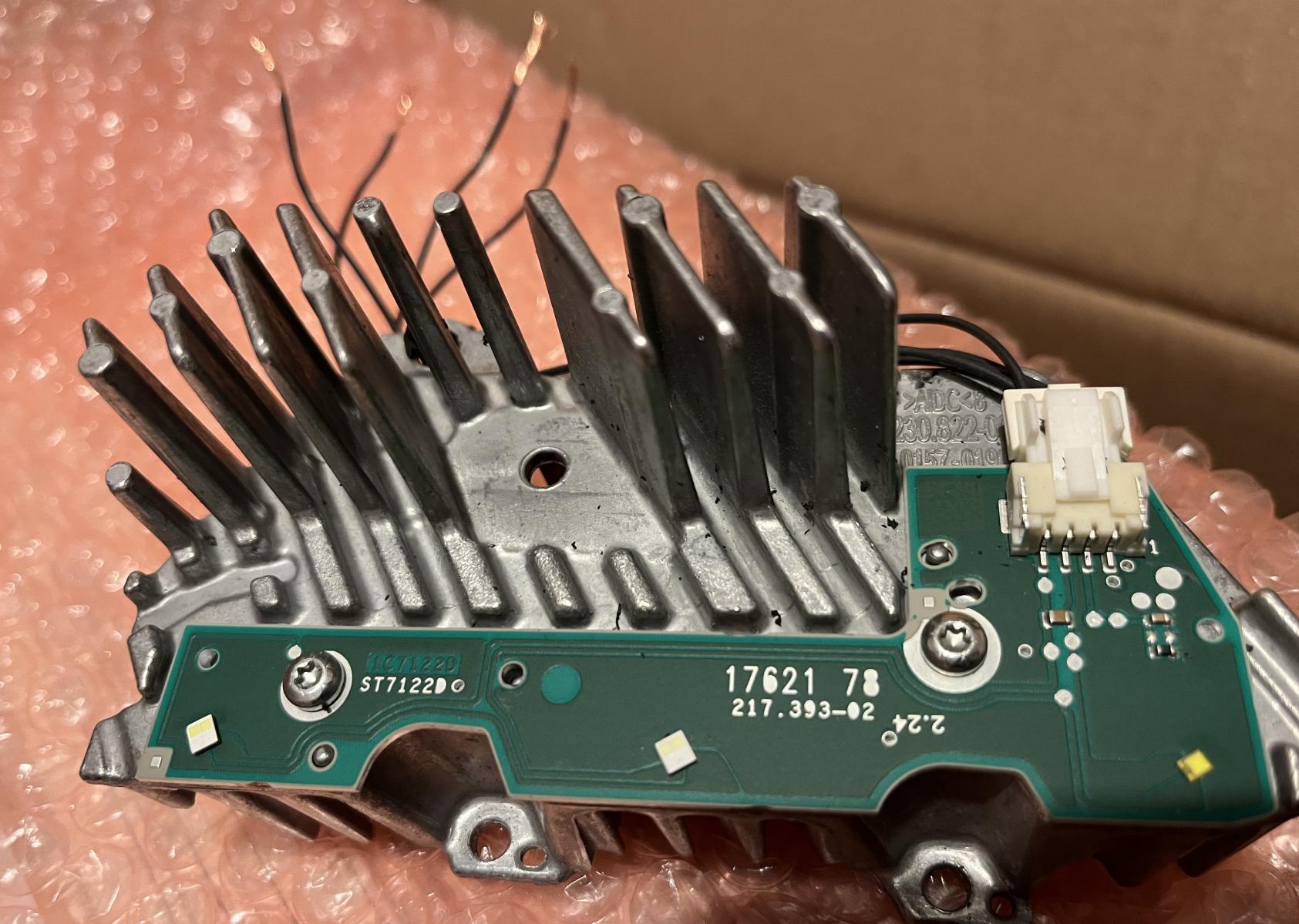 Ich habe hier LEDs aus einem Audi Scheinwerfer - wie kann ich die zum Leuchten bringen? Die im Bild nehme ich an, sind irgendwas wie Nebel oder Blinker gewesen, ich habe auch noch die anderen. 4 Drähte gehen dran, und 3 LEDs sind drauf. Einer der Drähte ist mit dem Kühlkörper und ? Masse? (habe auch + probiert) verbunden. Wenn ich jetzt 10V draufgebe, leuchten die LEDs nicht. Außerdem gehen auch an jede LED 3 Leiterbahnen. Ansonsten sehe ich keine Elektronik da drauf. Die anderen wie Standlicht und Blinker auf einer anderen Baugruppe sind so ähnlich verschaltet, jede Menge Einzeldrähte und einer an den Kühlkörper. Was ist hier das Geheimnis um die Dinger zum Leuchten zu bekommen?