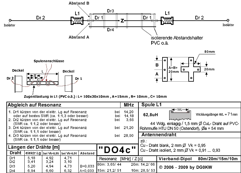 Vor kurzem schon im Thread Beitrag "Langdrahtantenne" schon angesetzt, aber jetzt unter passendem Betreff: Auf der Website vom DARC Ortsverband Stralsund gibt's Bauanleitungen vom "DG0KW" für Multiband-Dipole. Die DO4c für 80m, 20m, 15m und 10m (11m) hatte ich - mit bescheidenen Erfolg - nachgebaut. Es stellte sich natürlich die Frage warum die deutlich unter der erwarteten Performance (SWR in den vier Bändern) blieb. Um sich der Frage zu nähern, müsste man erstmal wissen wie man so eine Antenne entwirft und dabei die kritischen Punkte kennen. Vermutlich nutzte der Autor die Simulationssoftware MMANA-GAL. Habe mir die auch besorgt und die DO4c in der Theorie nachgebaut. Die Antenne besteht vereinfacht gesagt aus einem Dipol für das 20m Band, wo über Verlängerungsspulen noch Drähte im 80m für Resonanz sorgen sollen. Parallel zu diesen gespeisten Dipolen liegen in geringem Abstand je ein Halbwellen-Dipol für das 15m und das 10m Band. Letzteren habe ich probeweise durch einen fürs 11m-Band ersetzt. Die Simulationsergebnisse der Bauanleitung nach Feinabstimmung liefert für das 80m-Band schon deutlich schlechtere Werte als es die Anleitung verspricht: der Abgleich soll ein SWR <1,2 erreichen, in der Simulation sind bestenfalls 2,5 möglich. Und das auch nur in einem sehr, sehr schmalen Bereich, <50kHz. Viel zu wenig für das 300kHz breite Band. Die versprochene Performance auf den anderen Bändern wird dagegen nahezu in der Simulation erreicht. Aber ich habe die Antenne auch nicht genau nach Bauvorschlag aufgebaut, bzw aufbauen können. Die Antenne ist unterm Dach, d.h. hängend unter der Firstfette. Da das Haus nur 12m lang ist, mussten die 80m-Drähte hinter den Verlängerungsspulen abgewinkelt werden. Außerdem wurde nur 1,1mm Cu-Draht statt 2,0mm Draht genommen. Macht das wirklich was aus? Scheint so, dass das im höchsten Band (10m/11m) zu einem deutlich schlechteren SWR führt. Das Abknicken der 80m-Enden scheint, wie im FAQ der Bauanleitung schon vorhergesagt, keinen merklichen Einfluss zu haben. Aber die 80m-Antenne ist eh nur eingeschränkt brauchbar. Das nächste Problem unter dem Dach sind die sogenannten Windrispen: kreuzweise unter den Sparren über die Längsseiten vernagelte Stahlbänder, die Windlasten aufnehmen. Die habe ich als nächstes in die Simulation integriert. Deren Leitfähigkeit entspricht ca 3mm Cu-Draht. Deren Einfluss dämpft nochmal das höchste Band, erreiche damit nur noch ein SWR von 2,3 im 11m-Band. Auch 15m verliert etwas. Am Ende liegen die Simulationsergebnisse ziemlich dicht am realen Aufbau und den Nano-VNA Anzeigen. Wahrscheinlich könnte ich die Ergebnisse mit dickerem Draht auf den höheren Bändern verbessern. Im 80m-Band hilft das nicht, da verspricht der Bauvorschlag einfach zu viel. Vielleicht hat noch jemand eine Idee wie man das optimieren kann. Anbei der originale Bauvorschlag und die Simulationsergebnisse mit den drei Detaillierungen im PDF. Auf der letzten Seite Zusammenfassung und das Drahtmodell der Antenne incl Windrispen als Screenshot. Übrigens misslang die automatische Optimierung der Konstruktion innerhalb der Simu-SW, hab die Drahtlängen per Hand nach jeder Detaillierung optimiert. Vielleicht liegt auch noch Potential im Abstand der Dipole oder dem Wert der 80m-Verlängerungsspule, bislang nicht getestet.