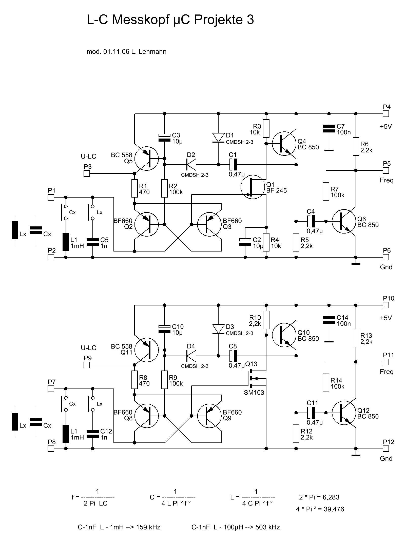Das Problem bei der L-Messung mit Schwingkreis ist, daß die Schwingschaltung über einen weiten Frequenzbereich und Gütebereich zuverlässig anschwingen muß. Daher kann man nicht eng dimensionierte Schwingschaltungen nehmen. Die Schaltung mit den 2 Transistoren ist z.B. sehr schwingfreudig. Die eine in der Luft hängende B-C Verbindung muß natürlich an GND, sonst kann ja kein Strom fließen. Für die C-Messung ist die Komparatorschaltung natürlich besser und genauer. Sie kann sogar sehr kleine Kapazitäten messen, indem man einfach den Ladewiderstand erhöht. Sie ist durch das Prinzip auch schon ohne Kalibration sehr genau, da der Ladewiderstand und der Spannungsteiler mit kleinem TK einfach zu beschaffen ist (wichtig: Ladewidestand, keine Konstantstromquelle, da die nur zusätzliche Fehler einbringt !). Niemand hindert einen aber daran, durch Ausmessen eines Referenzkondensators die Genauigkeit noch weiter zu steigern. Peter