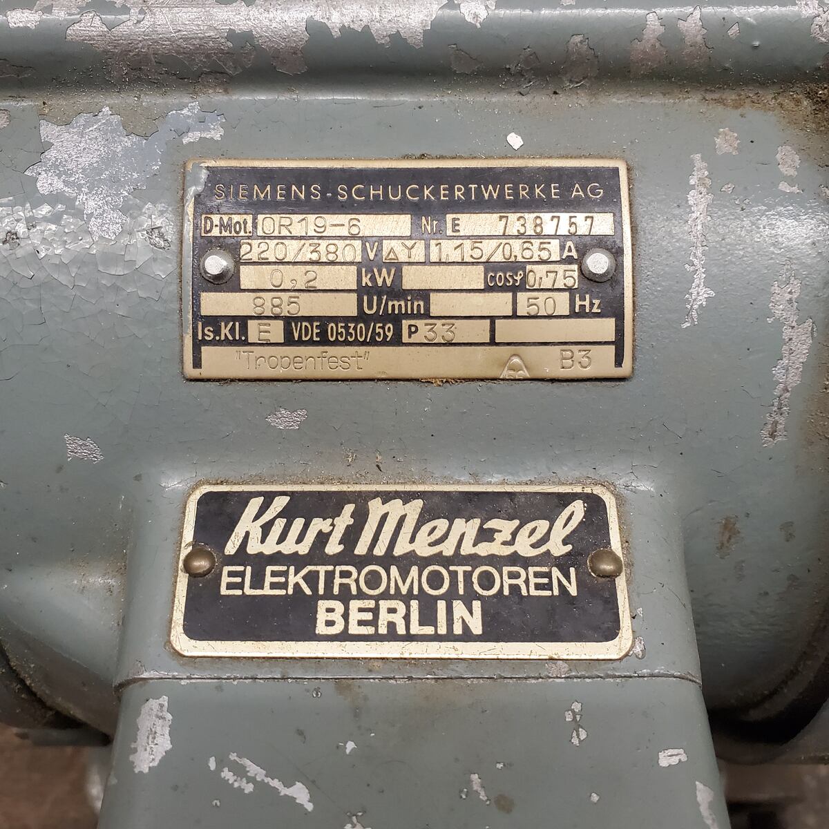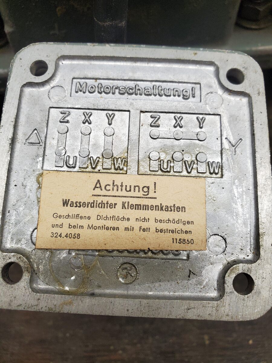 Hallo, hier noch ein paar weitere Bilder. Vergesst den derzeitigen Anschluss. Ein Bekannter hat ihn jetzt einfach an den normalen Wechselstrom angeschlossen. Aber da hat der Motor kaum Kraft. Verständlich. Aber Drehstrom ist vorhanden. Da kann ich ihn anschließen. So wie ich das sehe, ist der momentan auf Dreieicksschaltung mit den drei Laschen in der Vertikalen.