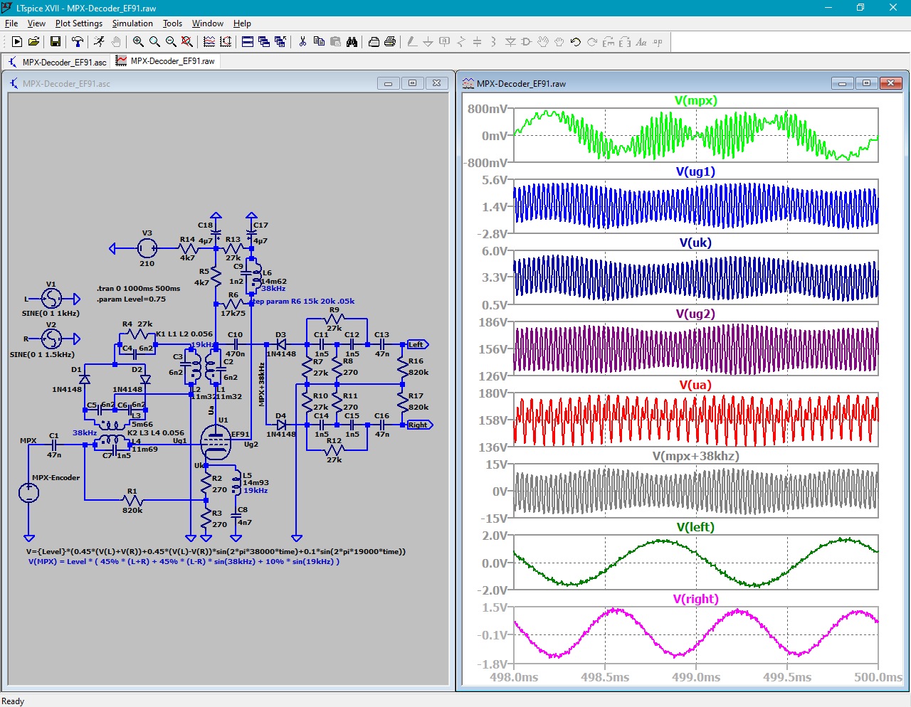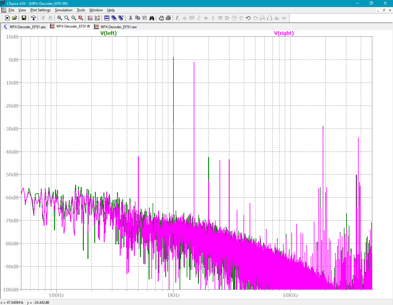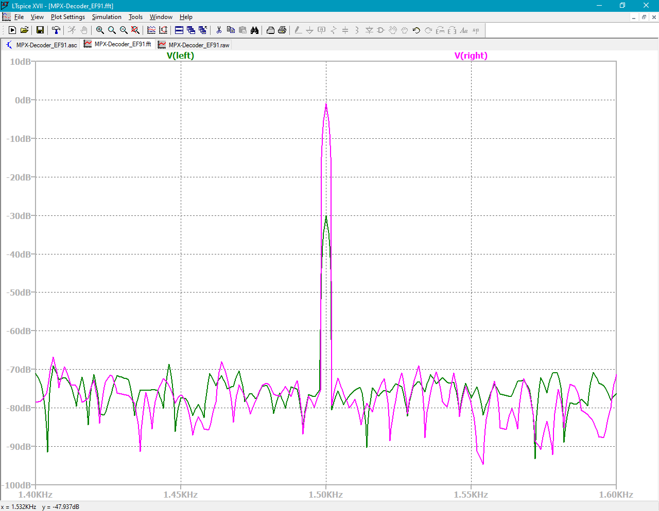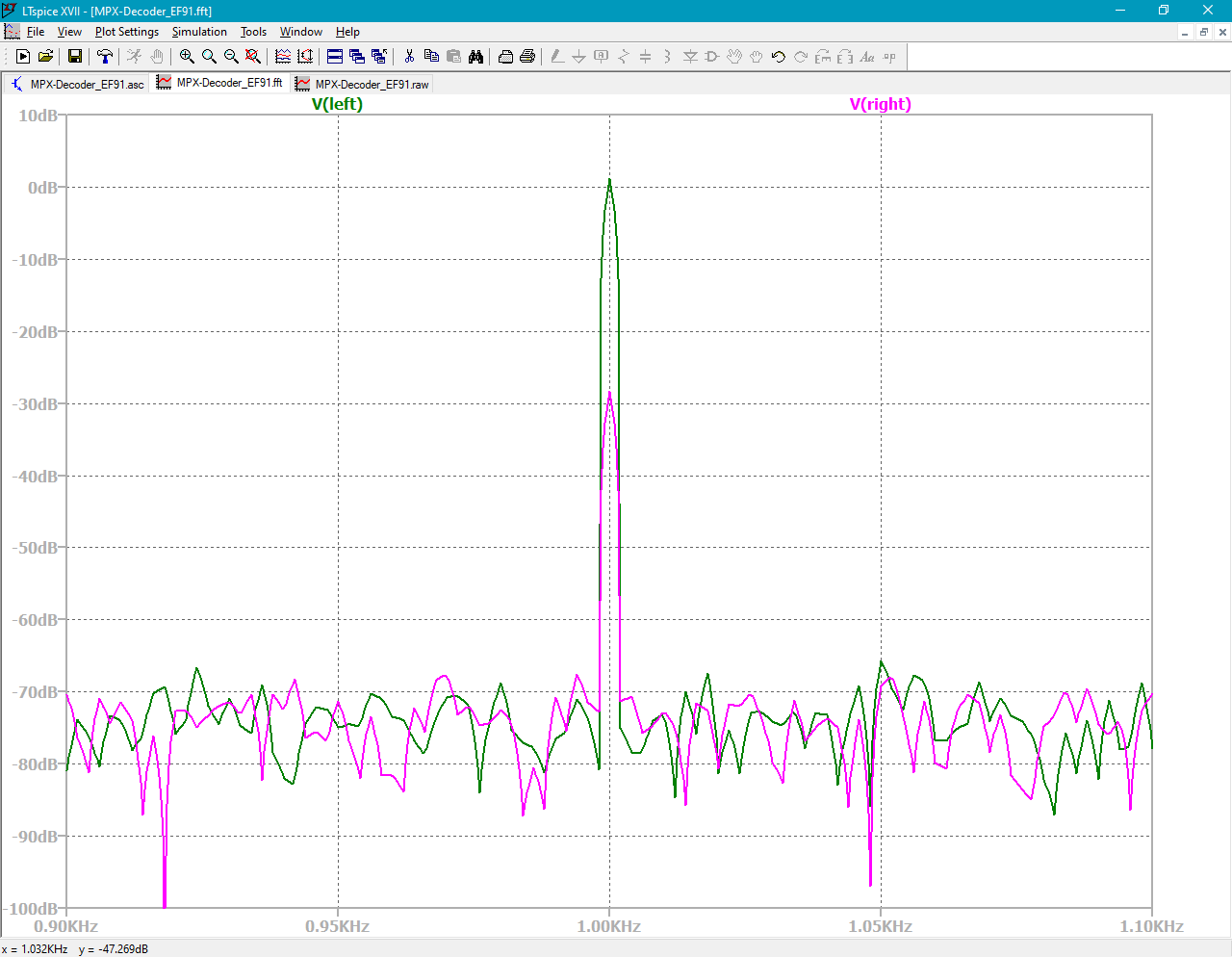 Wulf D. schrieb: > Sandra schrieb: >> Und andere basteln sich heute (naja, ist auch schon fast 10 Jahre her) >> noch einen Stereo-Dekoder mit einer Elektronenröhre und Filtern von >> Oppermann > > Tolle Sache: da wäre eine Spice-Simulation eine richtige Herausforderung > :-) > Ich sehe da keine wirkliche Herausforderung. Das MPX-Signal lässt sich mit einer einfachen mathematischen Formel beschreiben und die Formel einer "behavioral voltage source" zuweisen. Ein Simulations-Modell einer EF91 Pentode findet man im Web auch und die Schaltung des MPX-Dekoders ist auch schnell eingegeben. Hatte dafür heute etwas Zeit und Screenshots der Simulations-Ergebnisse sind angefügt. Sieht alles plausibel und soweit auch brauchbar aus. Dass der NF-Pegel nach dem Dekoder gegenüber 1kHz schon bei 1,5kHz etwas abfällt liegt an der fehlenden Pre-Emphasis des MPX-Signals und der vorhandenen De-Emphasis durch die T-Glieder für die NF-Signale nach den Hüllkurven-Detektoren.