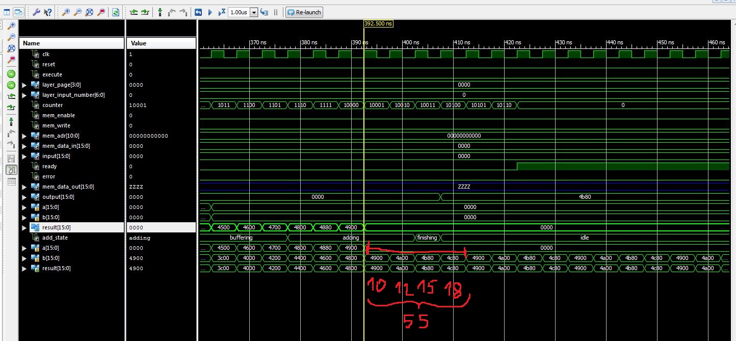 Hallo Martin, du scheinst mit ISIM schon deine Erfahrungen gemacht zu haben! ;-) Das hat mich auch schon ordentlich geärgert, aber für meine Zwecke tut es das meist. Das Problem, das ich hier habe, ist auch eher ein Architektur-Problem und keines, dass die Cores nicht richtig funktionieren. In der Simulation tun sie genau das, was das Datenblatt verspricht. Ein Ersatz der float16 in Fixpoint kommt nicht in Frage und macht auch in diesem Design keinen Sinn. Um eine ähnliche Auflösung zu bekommen bräuchte man irgendwas mit 30bit. Das ist bei der Multiplikation auch wieder schwierig, da die DSP48 nur 18x18bit können. Somit bräuchte ich für eine Multiplikation mehr als einen DSP48. Somit verringert sich direkt die Zahl der parallelen Berechnungen. Und wenn die Verschaltung der ganzen Geschichte von 16bit auf 30bit anwächst, kostet das auch Ressourcen, die nicht verfügbar sind im Chip. Martin S. schrieb: > Zum Pipelining: > Der Knoten steckt offensichtlich in deinem "Akkumulator", den du > haendisch aus einem (latenz > 1) behafteten Addierer strickst. Das > verletzt das 1-cycle-Akkumulatorprinzip grundsaetzlich :-) Das ist der Kern der Geschichte. Allerdings muss man nur das 1-cycle-Prinzip auf ein LATENZ-cycle-Prinzip erweitern, dann funktioniert es wieder. Ich habe nochmal von vorne angefangen. Bei Latenz=1 gilt das normale Akkumulator-Prinzip. Im nächsten Takt ist das Ergbenis aus In1+In2 am Ausgang vefügbar. Wenn man sich nun eine 6-Stufige Pipeline vorstellt, dann kommt am Ausgang etwas raus wie, In1+In7, im nächsten Takt In2+In8 und so weiter. Das heißt man kann die Werte am Ende in einer Adder-Tree-Methode addieren und man hat das richtige Ergebnis. Und genau das ist der Punkt! Es sind schon alle Werte im Akku drin (man hat ja auch alle reingefüttert), nur die kommen nicht in einem Ergebnis raus, sondern aufgeteilt in (in diesem Beispiel) sechs Werte. In dem Bild im Anhang kann man es erkennen: Hier ist die Pipeline 4 Stufen und am Eingang habe ich die Eingangswerte zur einfacheren Kontrolle geändert zu (1,2,3,4,5,6,7,8,9,10 --> Summe 55). Die Gewichte sind immer 1, so dass die Multiplikation nicht reinspuckt. Ich habe das mit mehreren Latenzen durchgespielt und das Ergebnis ist immer richtig, wenn ich, sobald alle Eingangswerte reingefüttert sind, die nächsten Werte, die der Latenz entsprechen, addiere. Das Zusammenfassen, der Ausgangswerte ist jetzt noch nicht implementiert, das kommt als nächstes. Grüße, Jens