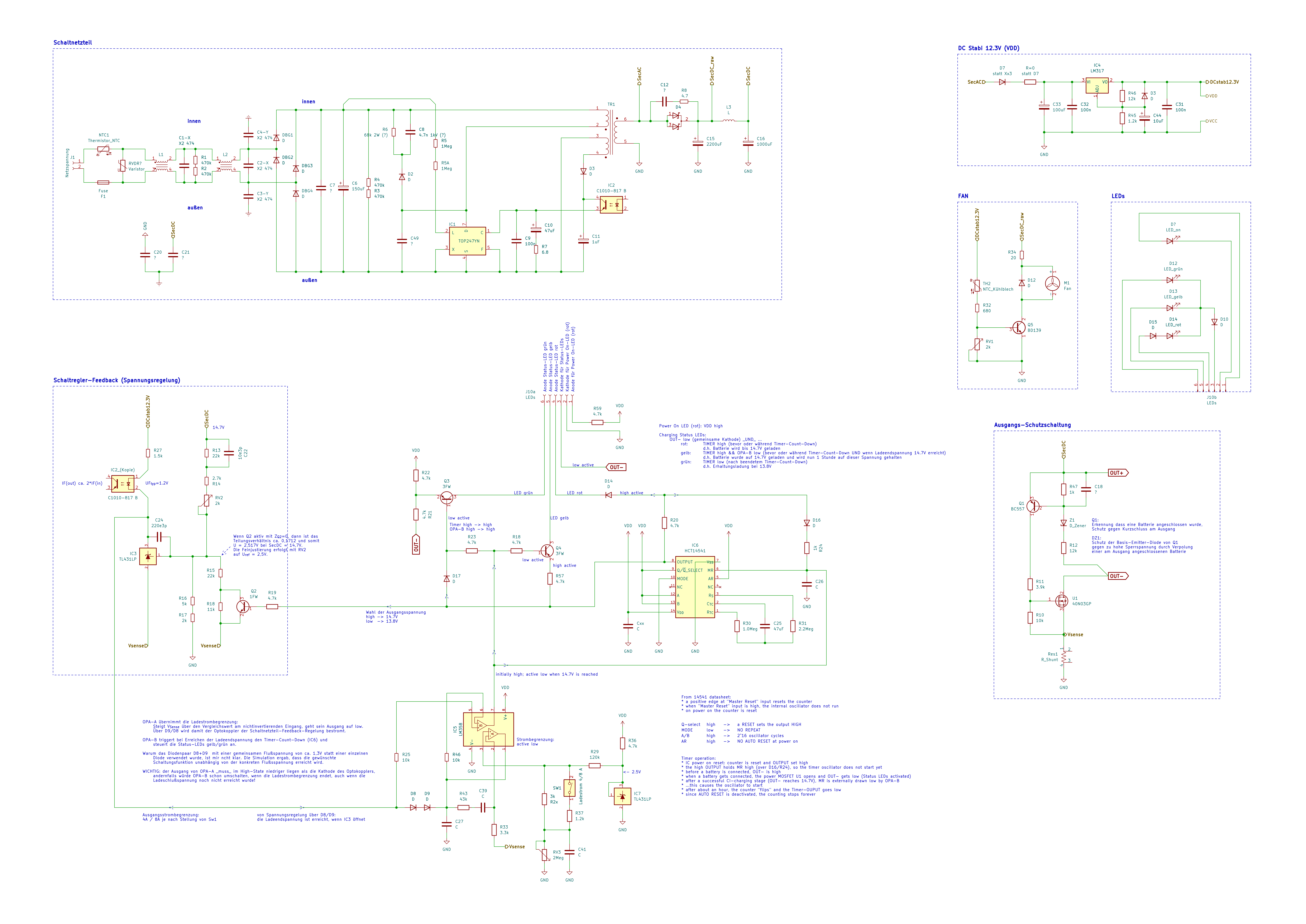 Moin Hans, danke für's Reingucken. Hans W. schrieb: > Der Ausgang vom OP-Amp B ist nur für die laden/fertig Anzeige. Er regelt > nichts. Doch, er triggert mit einer high-low-Flanke den Count-Down des MC14541. (Während dessen ca. einstündigen Countdowns soll die Spannung auf Ladeendspannung 14.7V bleiben und die Batterie mit allmählich sinkendem Strom weiter laden. Am Ende dieser Zeit schaltet der MC1451 Transistor Q2 aus und damit wird die Ausgangspannung des Schaltnetzteils auf Erhaltungsladung abgesenkt.) Hans W. schrieb: > Mir ist etwas anderes unklar: Wie kommt der - Eingang (= 1M Widerstand) > am Ende des Ladevorgangs auf eine höhere Spannung, als der + Eingang? > Ich sehe keine Quelle, die die Spannun am 1M Widerstand so hoch bringen > kann. Stimmt. Danke für den Hinweis. Aber hier gibt es leider auch ein Missverständnis, weil ich aus Versehen im hochgeladenen kompletten Schaltplan die "erfundenen" R??? und D??? drin gelassen habe. Die sind ja hardwareseitig nicht vorhanden (D??? ist ein Leiterzug). Der Ausgang von OPA A zieht also den invertierenden Eingang von OPA B hoch. Ich habe hier den kompletten Plan noch mal hochgeladen [[Datei:Ladegeraet.png]], exakt so wie die Platine bestückt ist (vorausgesetzt ich habe beim Re-Tracen keinen Fehler gemacht). Ralph K. schrieb: > wenn OpAmp-A-Ausgang gegen VDD geht (Strombegrenzung nicht aktiv), > sollte nach meinem Verständnis der nichtinvertierende Eingang von > OpAmp-B eine höhere Spannung sehen als der invertierende. Oops, man sollte sein Problem korrekt beschreiben können :-o War wohl gestern nicht mein Tag. Ich wollte schreiben: ... der invertierende Eingang von OpAmp-B eine höhere Spannung sehen als der nicht invertierende ... Das Problem ist, dass er das eben nicht darf, solange die Ladeschlussspannung nicht erreicht wurde, egal ob die Strombegrenzung zuschlägt oder nicht. Kann die Lösung vielleicht in ein paar Millivolt liegen?? Der Spannungsabfall am Optokoppler könnte bei kleinen Strömen z.B. nur 1.2V...1.3V sein, die Ausgänge des LM358 dagegen bleiben laut Datenblatt
