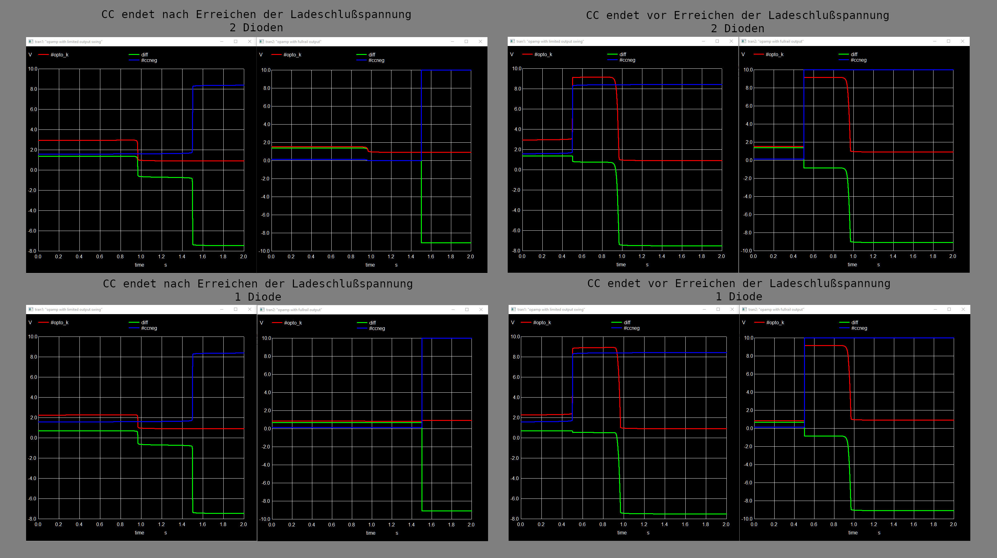 Da mein nur mäßig elektronisch trainiertes Hirn sich geweigert hat, die bisherigen Erklärungen als endgültige Wahrheit zu akzeptieren, habe ich die Sache inzwischen mal simuliert - siehe Bild im Anhang. Gezeigt werden je die zwei Potentiale "nonCC" (Ausgang von OPA-A) und "Opto-K" (Kathode des Optokopplers) sowie deren beider Differenz. In den Simulationen wurde etwa in der Mitte (nach 1s) die Ladeschlußspannung erreicht. Jedes der vier Teilbilder enthält zwei Diagramme: links das Ergebnis mit einem OPA mit einem ähnlichen Ausgangsspannungsbereich wie der konkret verwendete LM358 und rechts davon das Ergebnis mit einem "Full-Rail-to-Rail" OPA. Entscheidend für die Funktion der Schaltung ist nun, dass eine eventuell vor dem Erreichen der Ladeschlußspannung beendete Ladestrombegrenzung (siehe die beiden rechten Teilbilder) nicht bereits zum "Umschalten" von OPA-B führt. Anders gesagt: die Differenzspannung in den Diagrammen muss über null Volt bleiben, solange die Ladeschlußspannung nicht erreicht wurde. Ralph K. schrieb: > Kann die Lösung vielleicht in ein paar Millivolt liegen?? > Der Spannungsabfall am Optokoppler könnte bei kleinen Strömen z.B. nur > 1.2V...1.3V sein, die Ausgänge des LM358 dagegen bleiben laut Datenblatt > IOUT = 50 μA 1.35 ... 1.42 V > IOUT = 1 mA 1.40 ... 1.48 V > IOUT = 5 mA 1.50 ... 1.61 V > unter VDD. Dann wäre der Ausgang von OPA A also wie gefordert auch bei > "output high" immer unter der Spannung an der Kathode des Optokopplers. > Nur 'ne Idee. Taugt die was? Das Ergebnis zeigt, dass das die richtige Denkrichtung war. Damit der Ausgang von OPA-B auf HIGH bleibt, auch wenn die Ladestrombegrenzung vor dem Erreichen der Ladeschlußspannung beendet wird, muss die Ausgangsspannung von OPA-A halt immer unter der Spannung an der LED-Kathode des Optokopplers bleiben. Und das tut der konkret verbaute OpAmp LM358 auch, weil sein "Output Voltage Swing" so klein ist, dass er nie "VDD minus Spannungsabfall am Optokoppler" erreicht. Verwendet man stattdessen z.B. einen OpAmp mit "Full Rail-to-Rail"-Ausgang, sieht die Sache anders aus: das Ende der Ladestrombegrenzung würde vorzeitig zur Beendung des Ladeprozesses durch OPA-B führen, wenn dieser Zeitpunkt vor dem Erreichen der Ladeschlußspannung liegt. Die Simulation zeigt auch klar, dass die doppelte Flußspannung durch die zwei seriellen Dioden D8+D9 für die "Logikfunktion" unerheblich ist. Sieht jemand einen davon unabhängigen Grund, warum der Entwickler die zwei Dioden statt nur einer verwendet haben könnte?