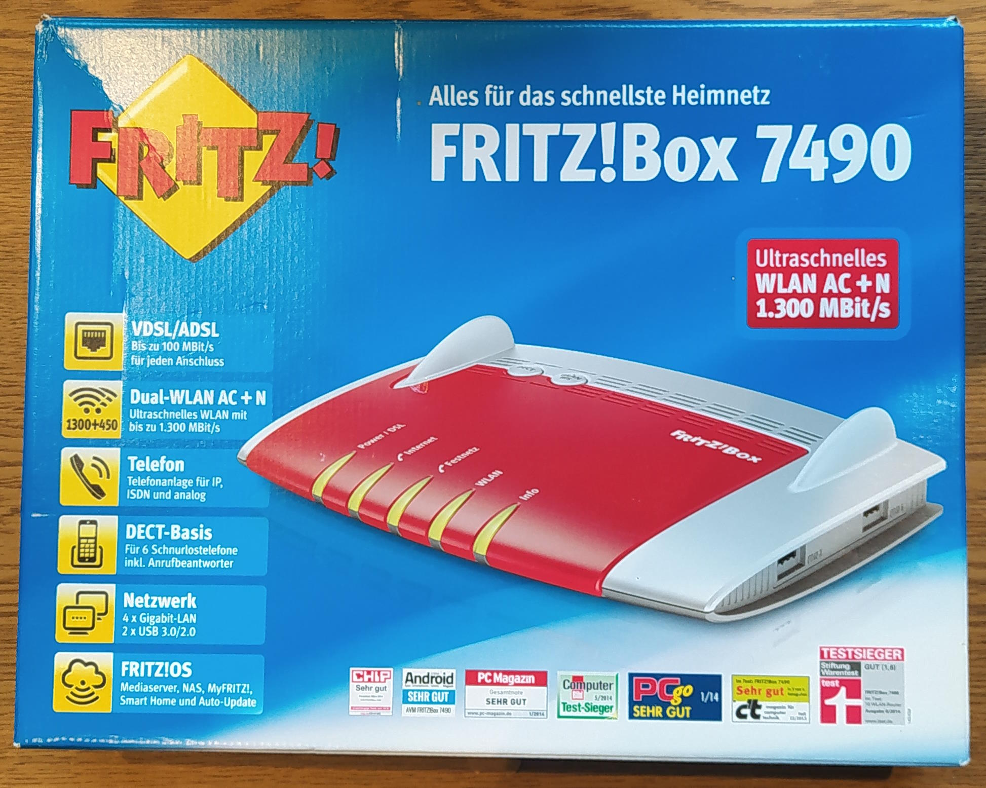 Moin, hier liegt noch eine FritzBox 7490 rum. Technisch ok (WLAN, LAN, DSL, Telefon, USB getestet, Elkos nicht dick, per Recovery zurückgesetzt), leider ist die Oberseite verkratzt und einer der Gummifüße fehlt. Lieferumfang - Box - Originalnetzteil - Original LAN und DSL-Kabel mit TAE-Adaptern - CD - Kurzanleitung - Alles im Originalkarton, leider ohne Inlay. 20€ inkl. Versand als DHL-Paket. Zahlung PP F&F (oder "normal" bei Übernahme der Gebühren) oder Überweisung. Jegliche Sachmangelhaftung ist ausgeschlossen. Ich würde Interessenten empfehlen, hier im Thread kurz einen Post zusätzlich zur PN zu schreiben, denn bei mehreren PNs entscheidet nicht das Los sondern der oberste Forumspost wer die Kiste bekommt.