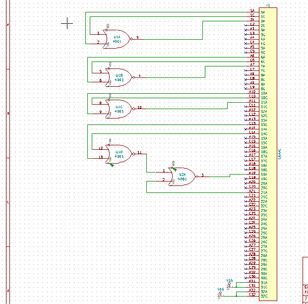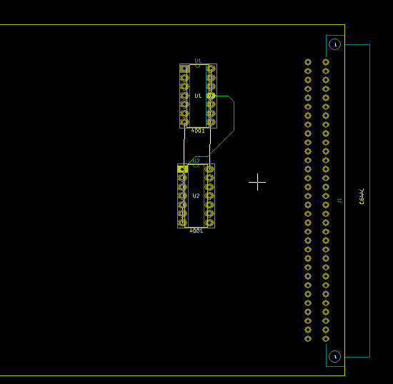 Hallo Forengemeinde, habe hier KiCad 4.07. Habe testweise 2 CD 4000 und eine Standard-Platinen-Messerleise C64AC. Im Schaltplan habe ich einige Verbindungen testweise von den 4000er zu der C64AC - Din-Leiste verbunden. Habe der Leiste und den 4000er Chips die Footprints hinzugefügt. Rule-Check soweit mal okay. Außer dass Kicad meckert wegen Spg-Pins. Es geht mir hier nur mal um die Messerleiste. Im PCB habe ich die erstellte Netzliste eingelesen. Verbindungen innerhalb der beiden 4000er Chips sind da. Aber die Verbindungen zur Messerleiste werden nicht dargestellt. Was mir aufgefallen ist, dass die Nummerierung zum einen im Schaltplan, und zum anderen im Footprint sich nicht decken. Ich meine damit A1, C1 ... A32, C32. Was kann da falsch sein, das die Verbindungen nicht da sind?