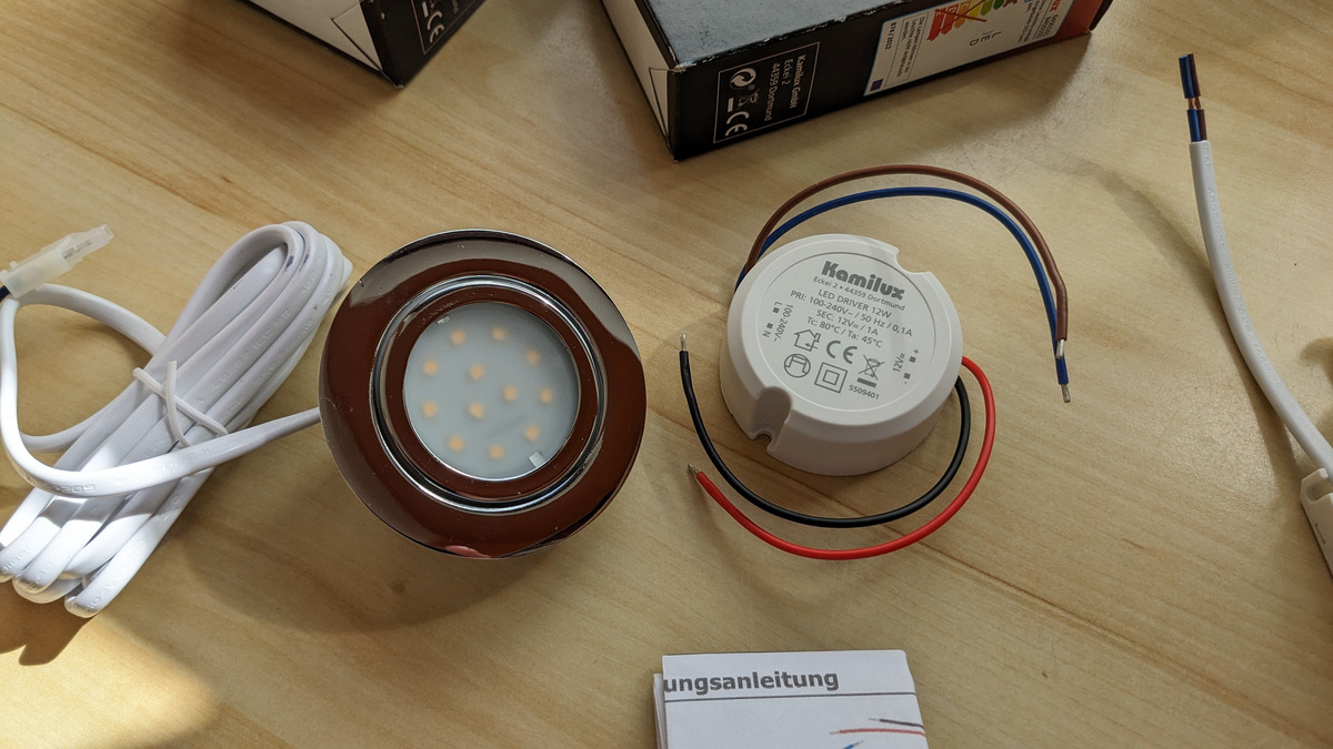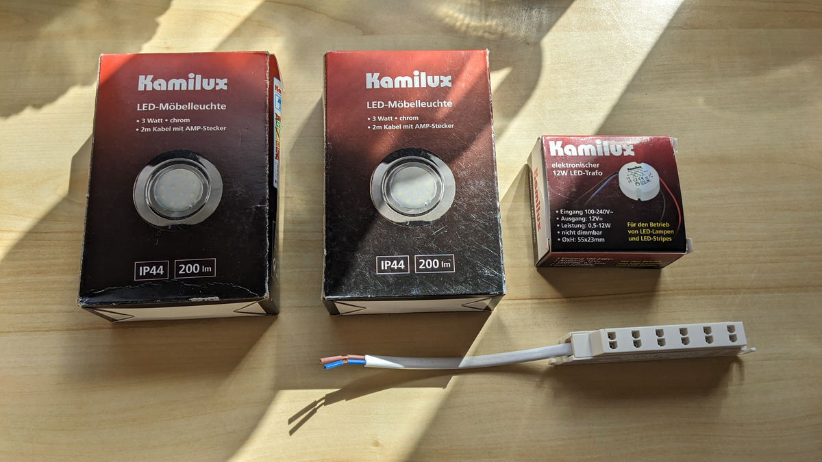 Ich verkaufe ein neues und unbenutztes Einbauset, bestehend aus 2 LED-Möbelleuchten (Einbaustrahler), LED-Trafo und Verteiler Für 60mm-Öffnungen Lichtfarbe: warmweiß 15€ zzgl. Versand (Neupreis für das Set ist 45€) Ich wollte damit die Halogenlampen in unseren Badezimmerschrank ersetzen, gab dann aber einen neuen.