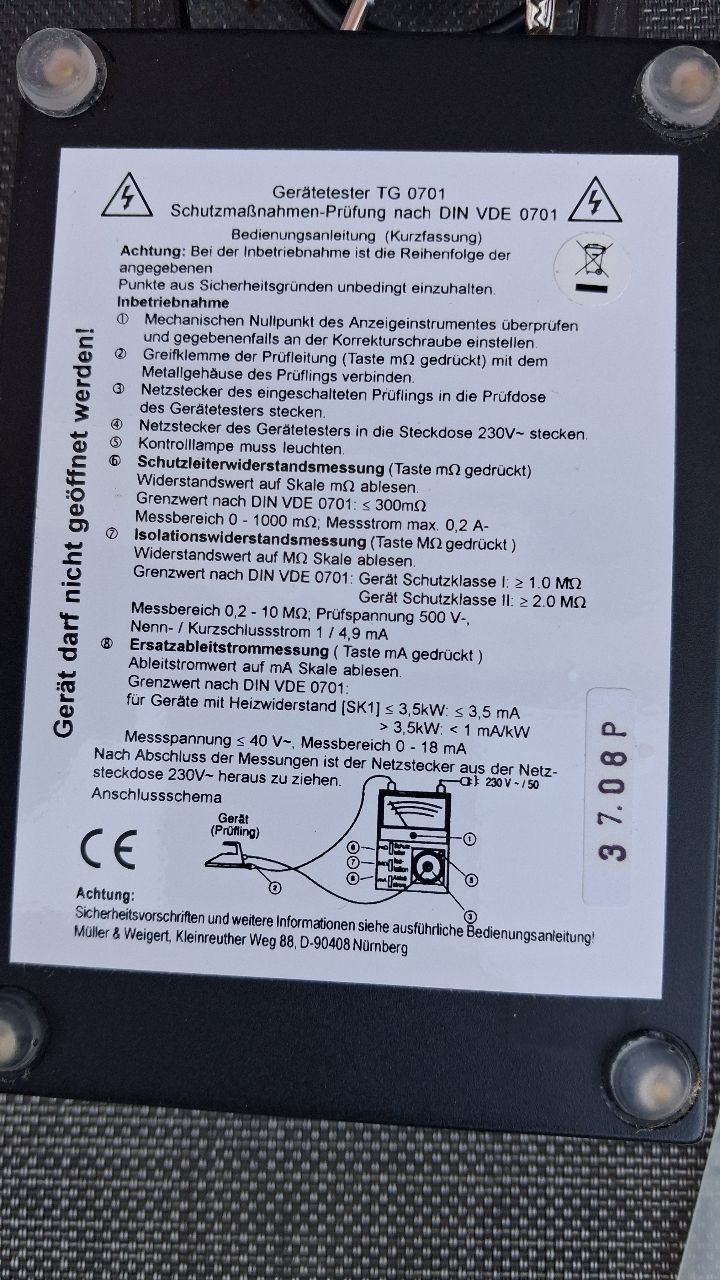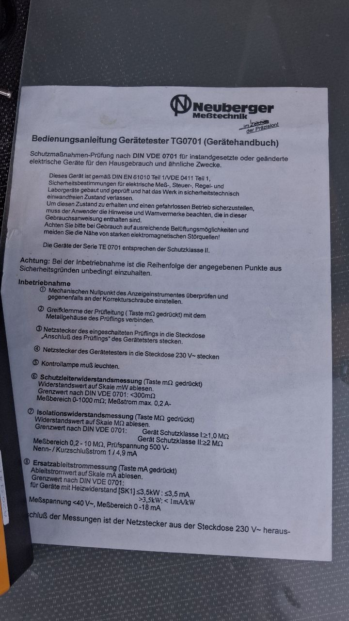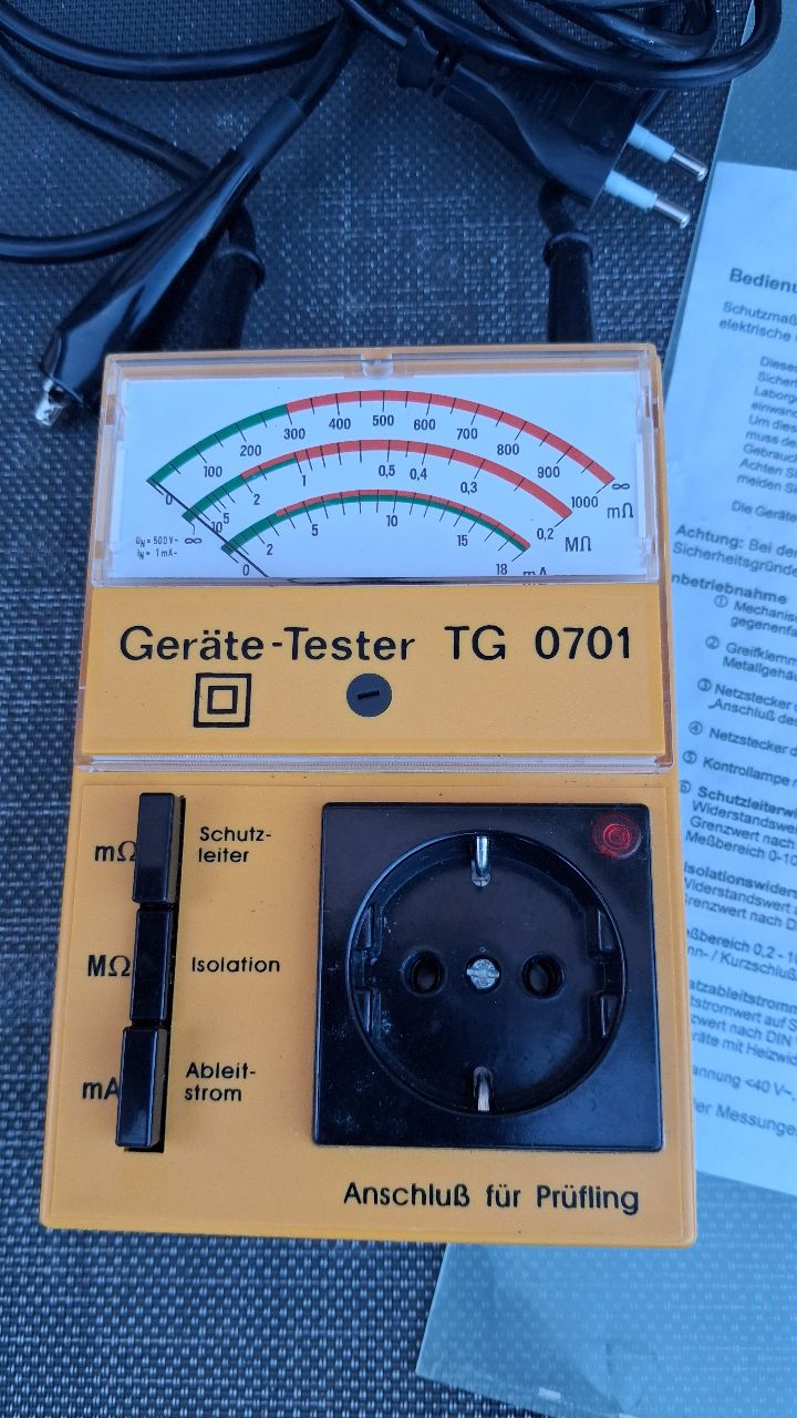 Verkaufe Gerätetester TG0701 (Messung Schutzleiterwiderstand, Isolationswiderstand, Ableitstrom). Gerät ist gebraucht, wenig genutzt. Die Funktion habe ich überprüft, er zeigt plausible Werte an. 90 Euro incl. Versand als versichertes Paket.