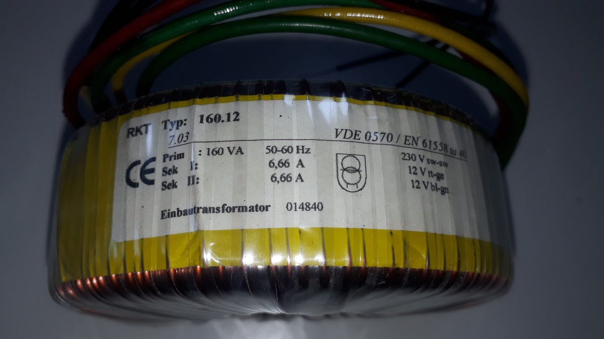 Hallo... Ich biete hier diesen Ringkerntrafo zum verkauf an. War mal für ein Audio-Projekt gedacht. Ringkerntrafo, 160 VA, 2x 12 V, 2x 6,66 A Reichelt-Nr.: RKT 16012 Leistung: 160 VA Betriebsspannung: 230 V Output: 2x 12 VAC Strom: 2x 6,66 A Ø: 115 mm Höhe: 42 mm Anschluss: offene Kabelenden Gewicht: ca. 1,7 kg Preis: 30,00 Euro, inkl. versichertem Versand in DE