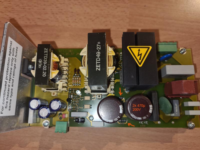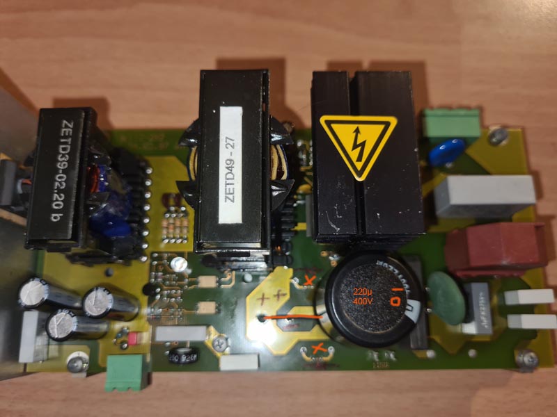 Hallo, gestern ist mir ein 24V 10A Schaltnetzteil Typ NSP 2410-1 unter viel Rauch und Gestank verreckt. Es machte nach dem Einschalten "Plöpp" und dann "Pffft" und stank, wie die Hölle! Einer der beiden Primärelkos hat dicke Backen gemacht und seinen Inhalt abgeblasen. Außerdem folgte ihm eine der Dioden am Entladewiderstand. Die 5A Gleichrichterbrücke und die 5A Gerätesicherung ließ das Ganze unbeeindruckt. Da ich 470µF 200V nix da hatte und die beiden Elkos ohnehin nur in Reihe geschaltet waren und ich nicht vor habe, das NT jemals mit 115V betreiben zu wollen, habe ich beide Elkos rausgeworfen, desgleichen die beiden markierten Dioden. die beiden in Reihe geschalteten MELF Entladewiderstände habe ich gelassen, nach einem kurzen Check auf ihren Widerstandswert. Statt dessen habe ich einen 220µF 400V Elko bestückt. Die + Fahne habe ich unter dem Elko flach umgebogen, mit Draht verlängert und die Lötstelle mit Capton Tape isoliert. Dann kam der - Pol ins Loch des rechten Elkos und die Drahtbrücke an den + Pol des fehlenden linken Elkos. Danach lief das Netzteil wieder. Alte, aber zuverlässige Technik :-)))