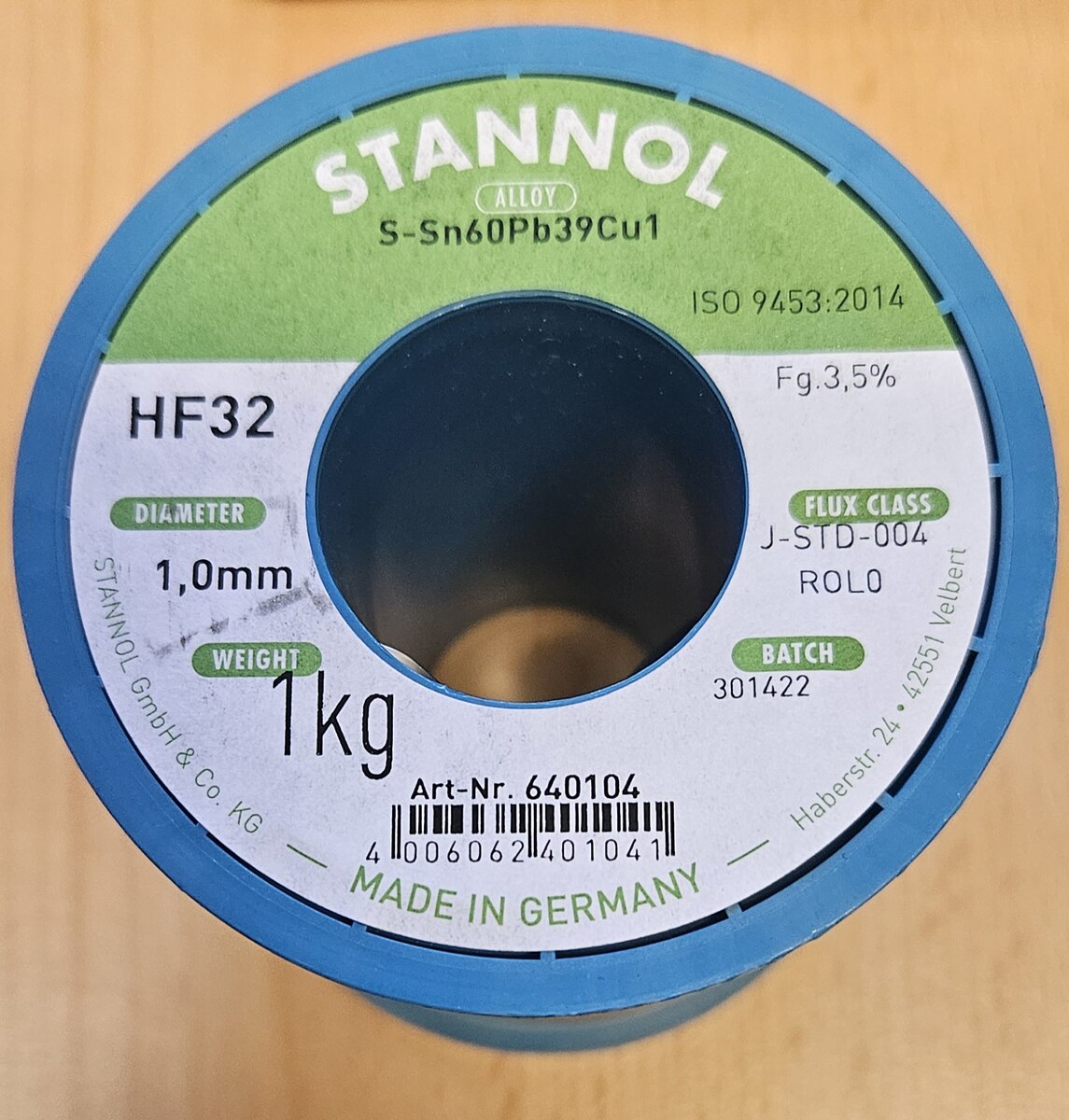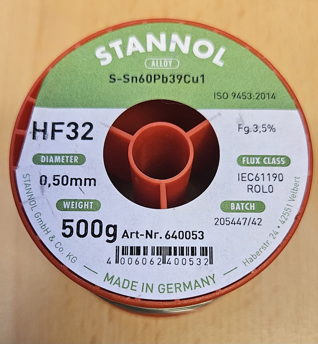 Hallo zusammen, ich verkaufe hochwertiges Stannol Lötzinn aus der professionellen HF32 Serie. Es handelt sich um halogenfrei aktiviertes Lötzinn, das für sehr gute Benetzung und saubere Lötstellen bekannt ist. Da es bleihaltig ist, ist es ideal für Reparaturen, Prototypenbau und den Hobbybereich (nicht für kommerzielle Neuprodukte gemäß RoHS). Hier die Details zu den Rollen: 1. Stannol HF32 – 0,50 mm (500g) Legierung: S-Sn60Pb39Cu1 (60% Zinn, 39% Blei, 1% Kupfer) Durchmesser: 0,50 mm (perfekt für SMD und feine Arbeiten) Gewicht: 500 g Flussmittel: HF32 (halogenfrei, No-Clean), Anteil: 3,5% Zustand: Neu & unbenutzt Art.-Nr.: 640053 Preis 39,00 € Inclusive Versicherten Versand. 2. Stannol HF32 – 1,0 mm (1kg) Legierung: S-Sn60Pb39Cu1 (60% Zinn, 39% Blei, 1% Kupfer) Durchmesser: 1,0 mm (ideal für Durchsteckmontage/THT und größere Lötstellen) Gewicht: 1 kg (Vorratsrolle) Flussmittel: HF32 (halogenfrei, No-Clean), Anteil: 3,5% Zustand: Neu & unbenutzt Art.-Nr.: 640104 Preis 59,00 EURO incl Versicherten Versand. Versand & Zahlung: Versand erfolgt als versichertes DHL-Paket Zahlung per PayPal (F&F) oder Überweisung möglich.