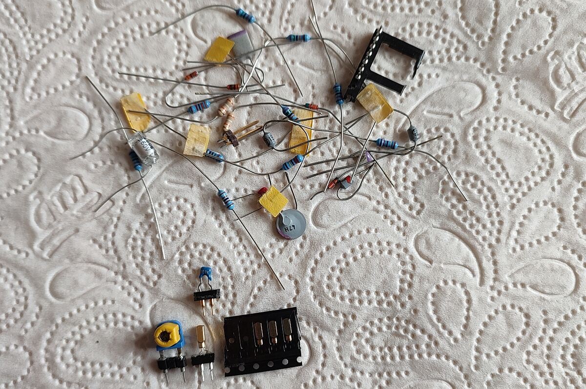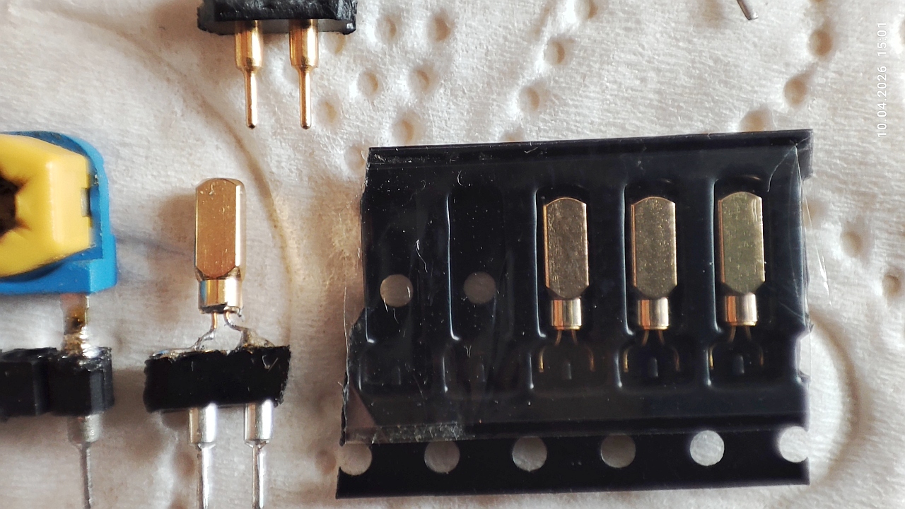 Ich habe in den letzten Jahren gelegentlich große Teile aus Nachlässen aufgekauft. Dabei zuletzt auch von jemandem, der vorgesehene Projekte in Zip-Tüten vorsortiert hat. Teilweise mit Leiterplatten und aktive BEs, einige Tüten aber nur die passiven BEs. Hier z.B. ein Tüteninhalt mit u.a. vier unbekannten Teilen. Mein Chinesischer Komponententester erkennt nichts, mein Quarztester reagiert auch nicht. Der Kollege hatte noch zwei Kondensatoren auch auf diese "Sockel" gelötet, daher vermutete ich zunächst Quarz oder Spule, aber nichts reagiert. Old-Papa