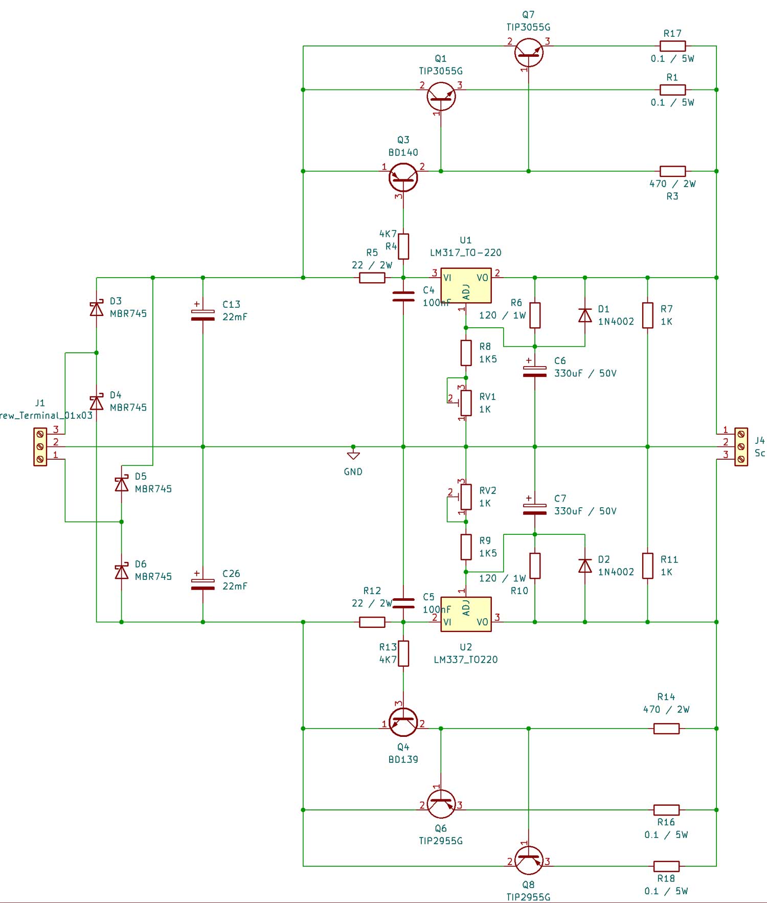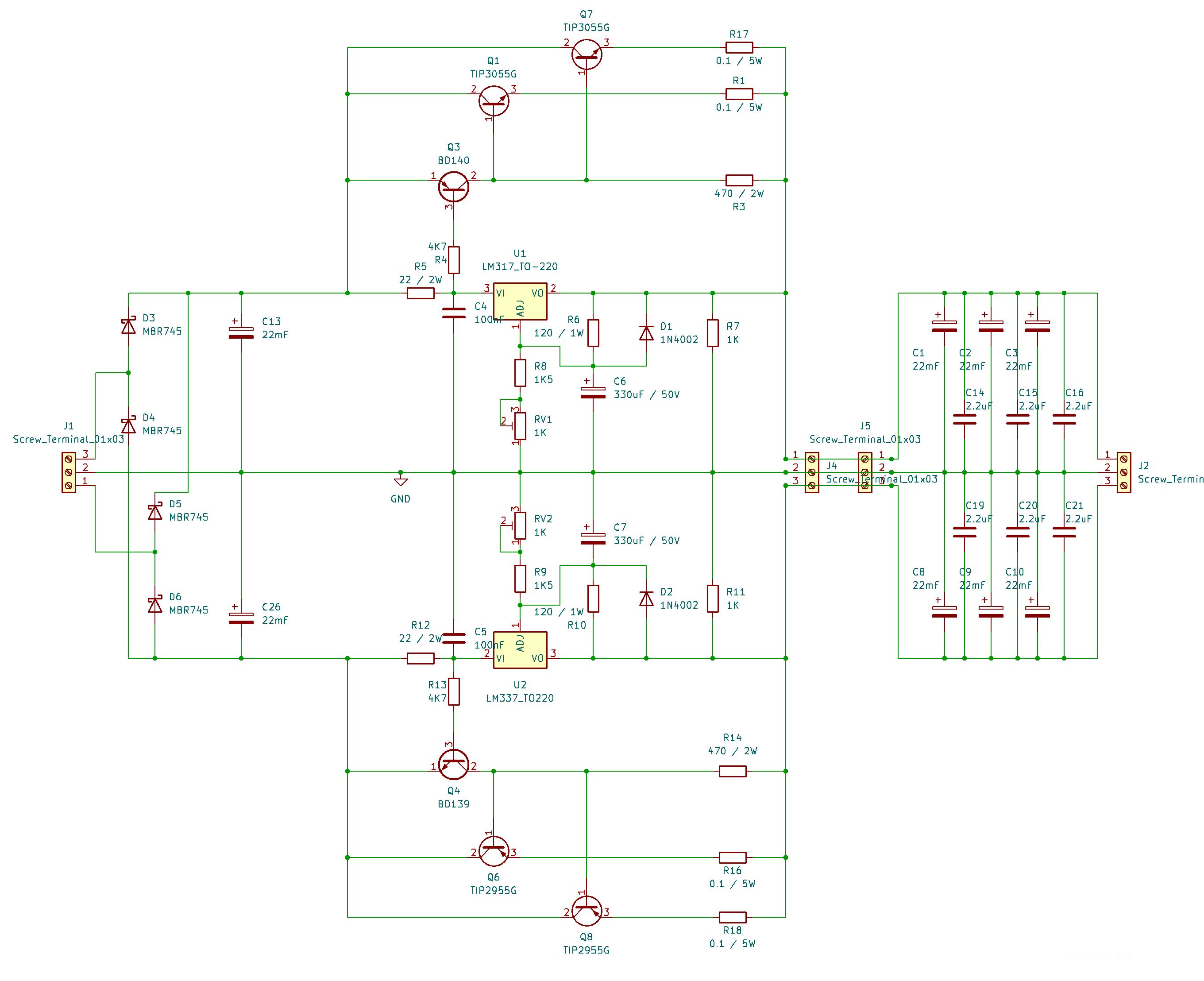 Hallo Leute, ich versuche schon seit Tagen ein einfaches Symetrisches Netzteil zum laufen zu bekommen. Aufgebaut mit den LM317 und LM337. Die Positive Spannung funktioniert, ich kann sie mit dem Trimmer einstellen. Doch die Negative will nicht, die liegt immer so um die 4 bis 4.5 Volt, egal was ich am Trimmer einstelle, höher gehts nicht und auch nicht niedriger. Der LM337 ist in Ordnung, habe den auf einem Steckbrett getestet, aber auch noch durch einen neuen ersetzt. Auf dem Steckbrett in einer im Datasheet angegebenen Beschaltung klappt alles. An ein einzelnen Bauteil kann es glaube ich auch nicht liegen, da ich 2 von den Netzteilplatinen aufgebaut habe und der Fehler bei beiden auftritt. Platinen sind mit KiCAD gemacht (und von JLCPCB) und entsprechen genau dem Schaltplan. Wo denke ich falsch, oder was könnte es noch sein. Einer vielleicht eine Idee / Vorschlag ? Grüße Dirk