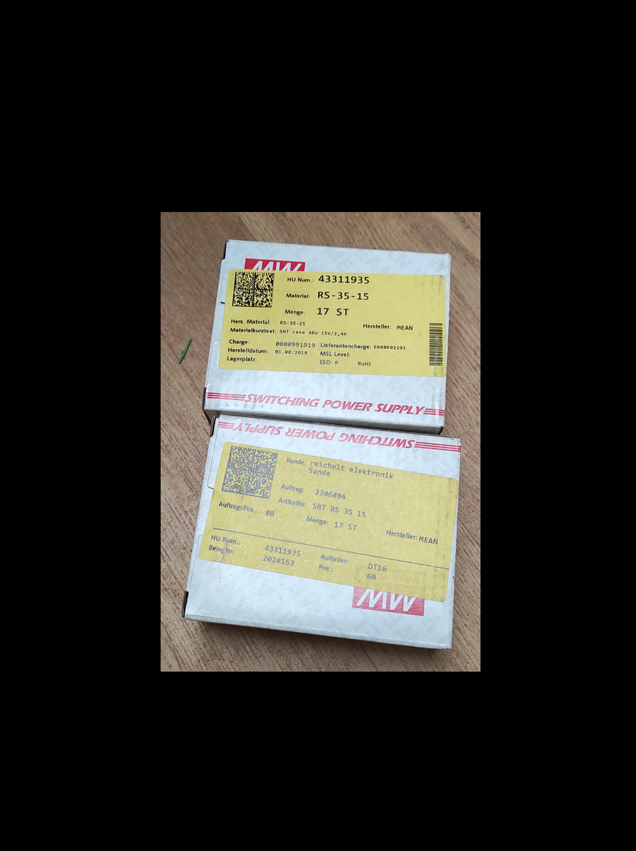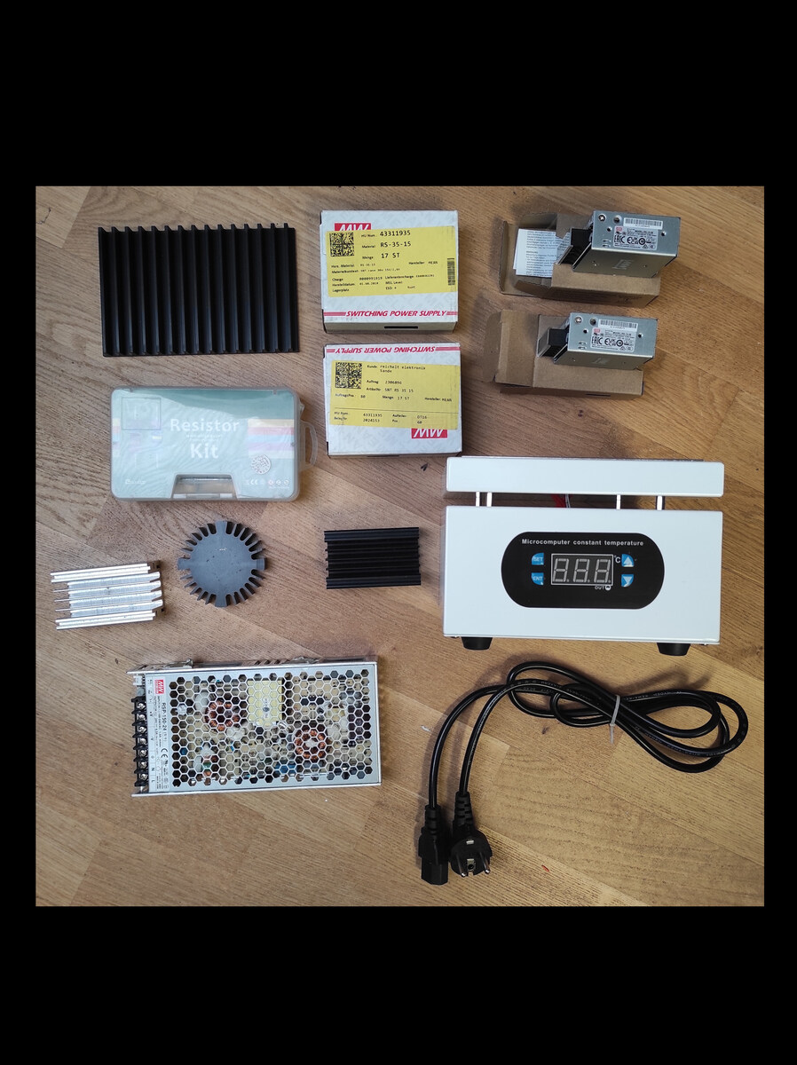 Moin Dieses wundervolle Konvolut trägt den traurigen Namen "Dinge mit denen ich seit Jahren nächstes Jahr ganz bestimmt ein tolles Projekt machen will". Und dann kommt das Leben... Es steht nur als Komplettpaket zum Verkauf, inkl. Versand per DHL VB 50 € Überweisung, Paypal. Ich fasse die Fotos nochmal zusammen: - Widerstandskit bedrahtet - Mean Well RSP-150-24. Hinten zwei Reste von Klebepads dran - 2 x MW RS-35-15 - 2 x MW RS-35-48 - Heatplate vom Chinesen - 4 Kühlkörper. Die Heatplate war jüngst in Betrieb. Der Rest lag halt warm und trocken im Haus. Gruß Holger