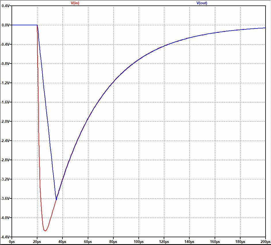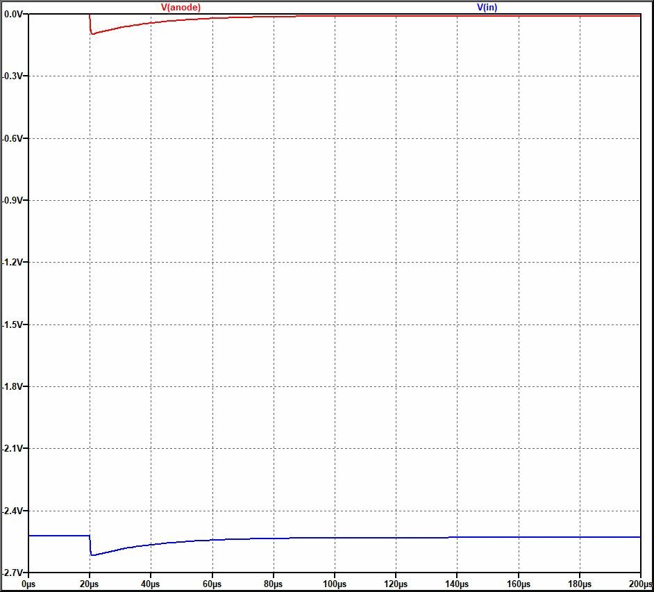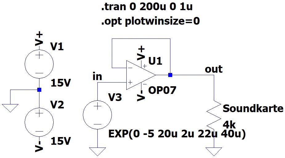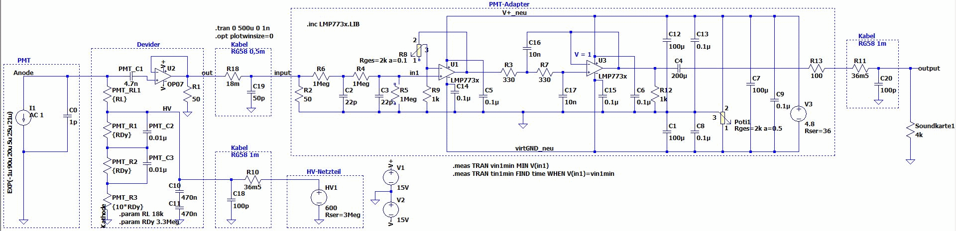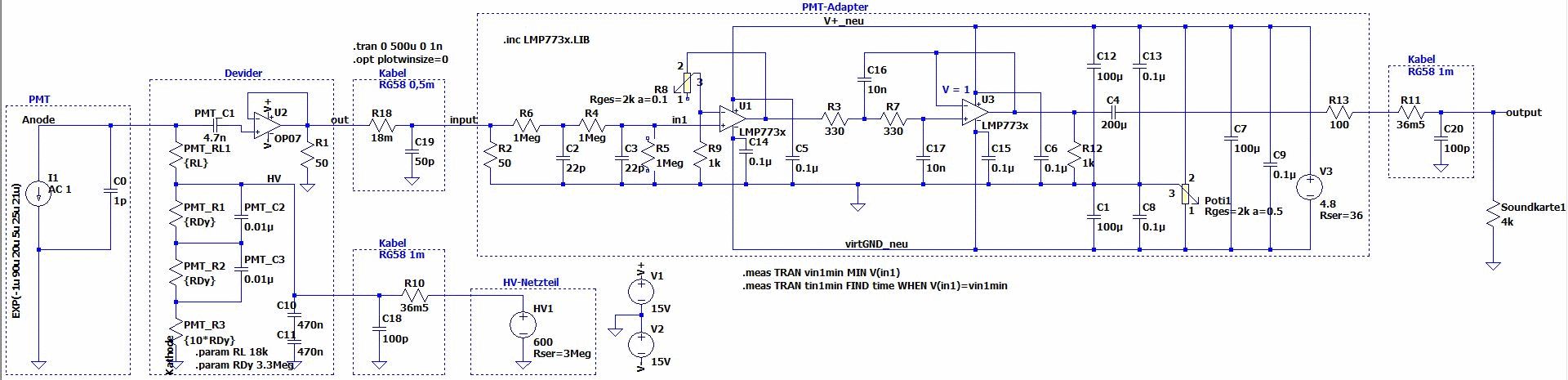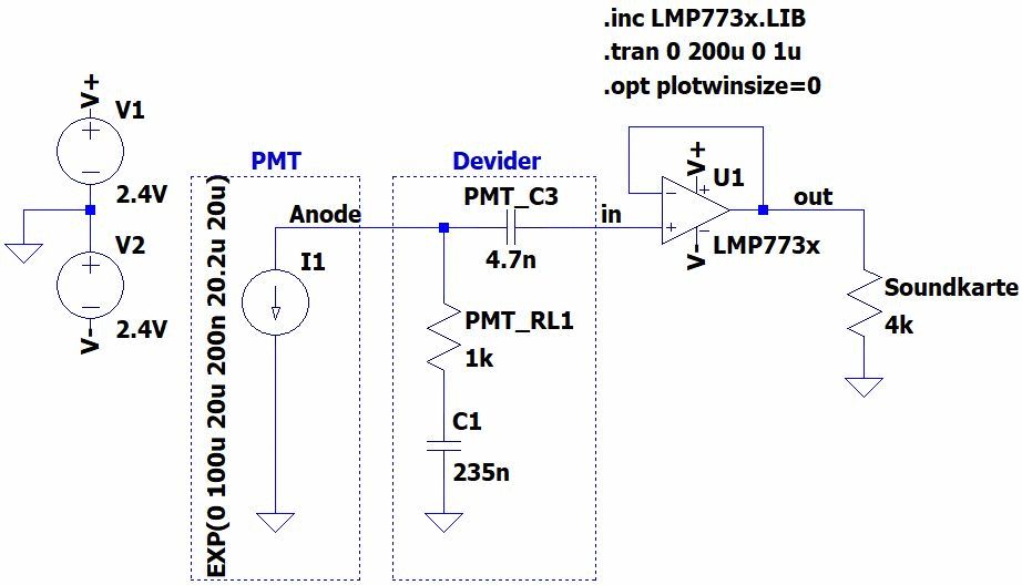 Hallo, ich musste entdecken, dass sich ein Impedanzwandler nicht so leicht realisieren lässt, wie es in den Lehrbuchbeispielen dargestellt wird. Noch versuche ich den Phänomenen mit LTspice auf die Schliche zu kommen; ich experimentiere also noch nicht mit konkreter Hardware. Anbei Mal ein vereinfachtes Schema mit verschiedenen OpAmps. Wenn ich mir im OP07_Test den Vergleich von in und out ansehe, dann muss ich sagen: So etwas kann ich nicht brauchen! Die Szintillation geht davon aus, dass die max. Amplitude des Pulses proportional zur Energie des Zerfallsereignisses ist. Das ist sie mit dem OP07 ersichtlich nicht. Und dann hab ich auch Mal den LMP773x eingesetzt. Auf dem Weg vom Knoten „Anode“ zum Knoten „in“ bekommt das Signal einen Offset von -2,5 V. Warum? Woher? Wieso? Wie kann ich das verhindern? Außerdem habe ich ausprobiert: AD4500, MCP601, LM6172, ADA4625, ADA797 Damit erhalte ich DC-Offsets, die ich für das Folgende nicht brauchen kann, oder ich bekomme völlig unerwartete Outputs. Jedenfalls nicht was ich von der Funktion eines Impedanzwandlers erwarte. Wozu brauche ich das Ganze: Ich experimentiere mit einem Szintillationsdetektor aus NaI-Kristall und Photomultiplierröhre (PMT). Der PMT besteht aus Kathode, 10 Dynoden und Anode. Zur Beschaltung des PMT dient ein Divider, der eine Hochspannung von 500 bis 1200 VDC auf die PMT-Elemente verteilt und das Signal der Anode auskoppelt. Für den DIY-Bereich wird zur Digitalisierung eine Soundkarte verwendet. Das direkte Anodensignal ist aber zu schnell / hochfrequent, daher braucht es einen PMT-Adapter, der das Anodensignal so weit in die Länge zieht, dass es die Soundkarte auch digitalisieren kann. Für all das existiert freie Software und Open-Hardware-Projekte als Vorlage für Divider und PMT-Adapter. In meinem PMT-Adapter arbeiten 2x LMP7731 (Noise f=1kHz 2.9nV/sqrt(Hz), CMRR 130dB, GBW 22MHz, Slew Rate 2.4V/us). Ob diese Werte nötig sind, weiß ich nicht, aber der Impedanzwandler sollte diese Werte – nach Möglichkeit - nicht unterschreiten. Divider und PMT-Adapter sind mit einem BNC-Kabel (50Ohm Impedanz) verbunden. Der Impedanzwandler soll zum einen Fehlanpassung verhindern. Der zweite Grund für den Impedanzwandler ist etwas komplexer. Das Anodensignal wird als Stromquelle angesehen und als solche simuliert. Mit einem Lastwiderstand im Divider lässt sich bestimmen, wie groß die Spannung des Signals am Dividerausgang ist. Ohne Impedanzwandler wird der Anodenstrom in zwei Ströme geteilt, die im Zeitverlauf und in der Amplitude sehr unterschiedlich sind. Mit Impedanzwandler sollte der Lastwiderstand im Divider die Spannungsamplitude eindeutig bestimmen und außerdem kann ich ihn als Shunt nutzen um – mit einem Oszilloskop – Amplitude und Zeitverlauf einzelner Anodenimpulse zu bestimmen. Gruß Andreas