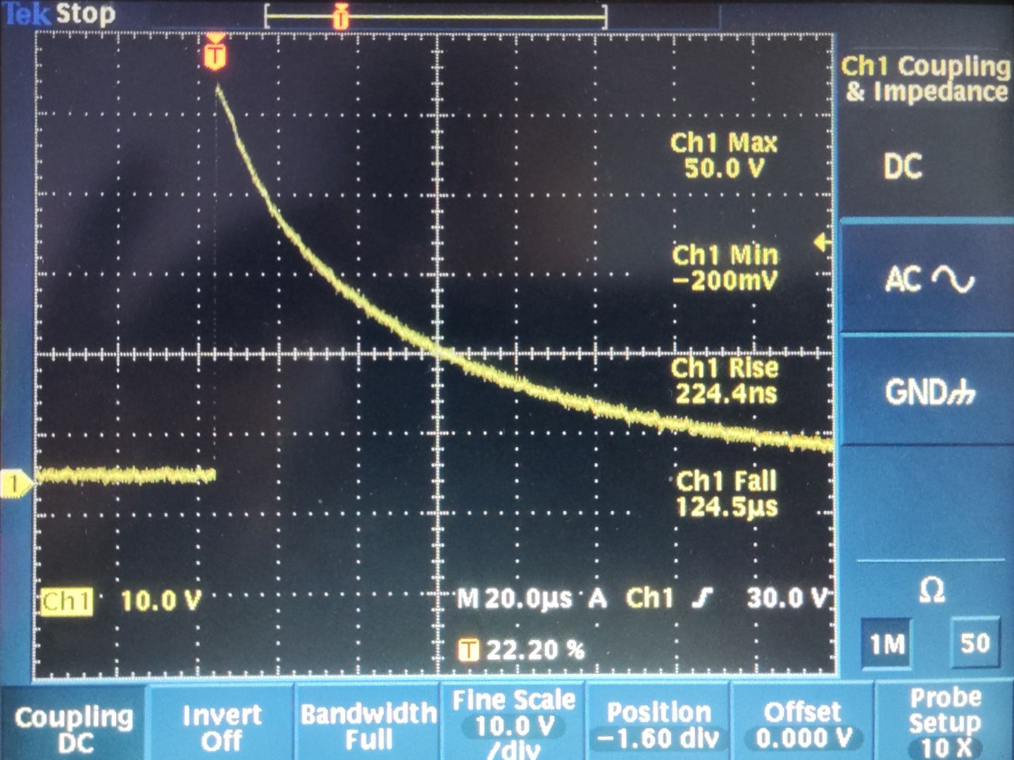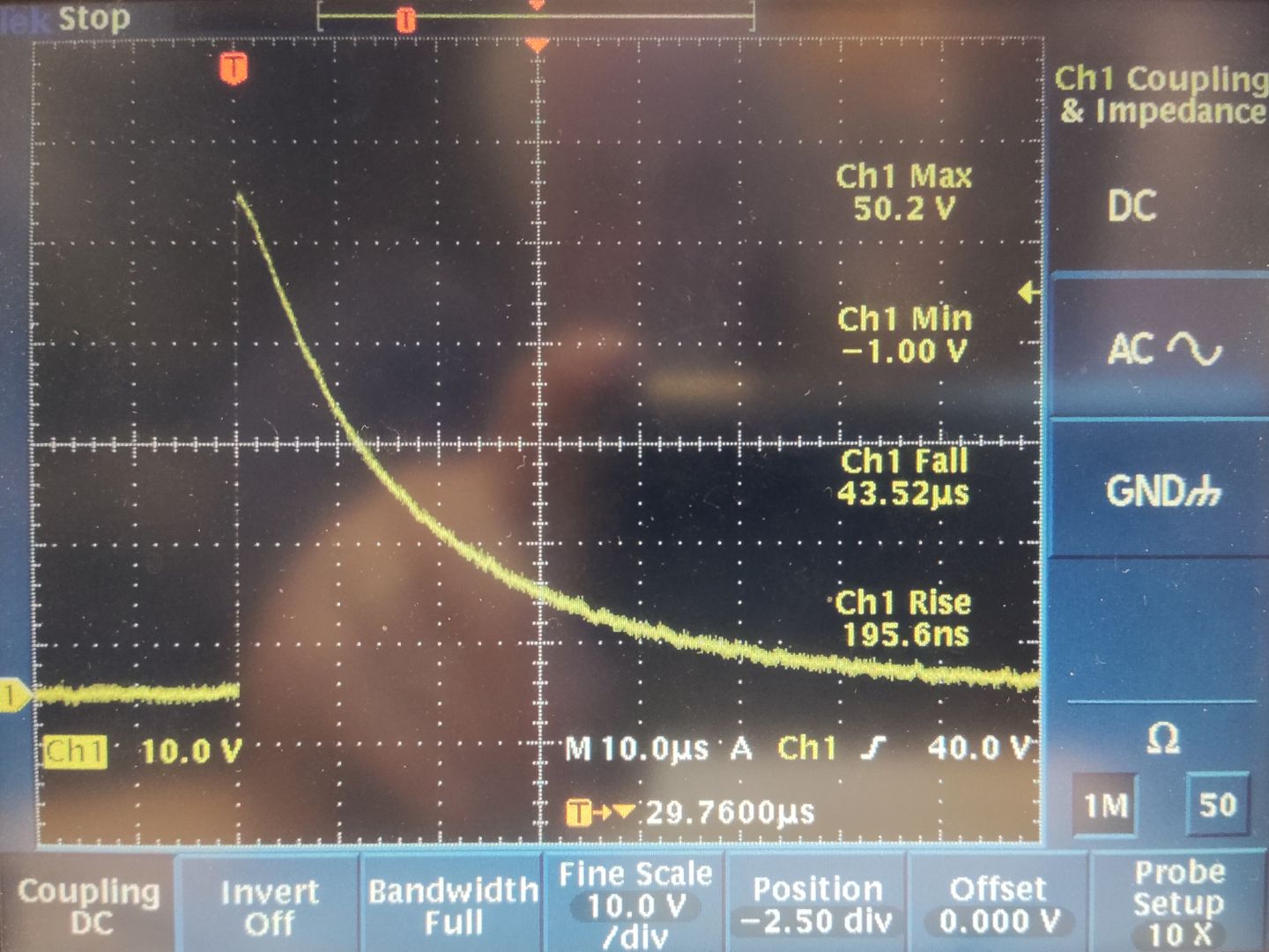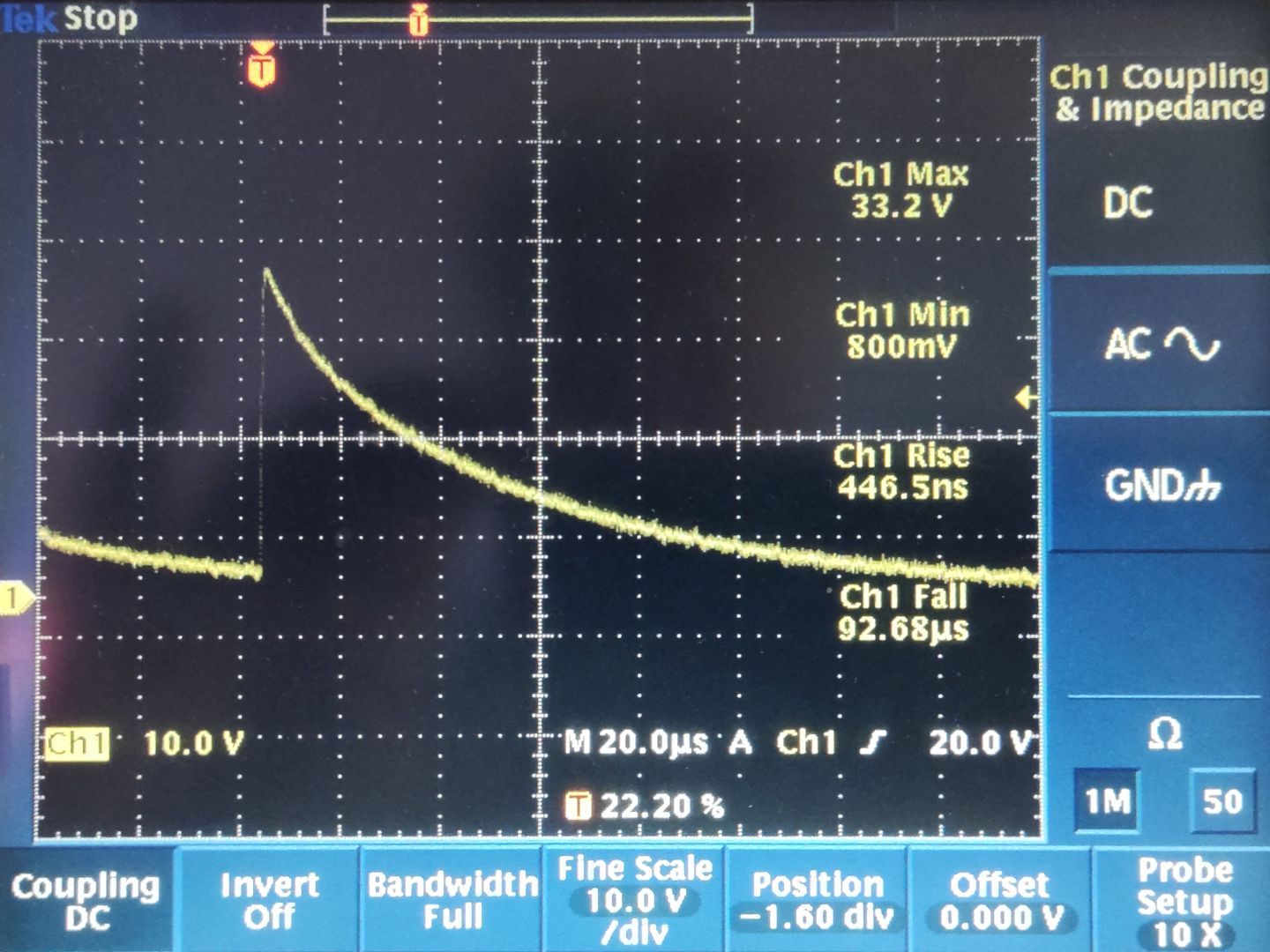 Hallo Udo S., Udo S. schrieb: > Kläre doch erst mal welche Signalform du hast. das ist leider nicht so genau zu sagen. Letztlich will ich mir mit dem Impedanzwandler die Möglichkeit schaffen die Anodenpulse möglichst gut ausmessen zu können. Ohne Impedanzwandler müsste ich beide Ströme (den durch den Lastwiderstand im Divider und den zum PMT-Adapter) erfassen und addieren um annährend den Anodenpuls zu erhalten. Mit einen Tektronix habe ich die folgenden Pulse am Lastwiderstand abgenommen. Für den 1. Puls hatte der Lastwiderstand 330kOhm und die Signalleitung war offen (kein PMT-Adapter angeschlossen). Für die beiden anderen hatte er 1MOhm und an der Signalleitung hing eine Last von 3 bzw. 6MOhm (nur als einfacher Widerstand, also nicht der PMT-Adapter). Problem dabei ist die Stochastik der Zerfallsereignisse. Für die 3 Messungen waren die Energien und damit die Amplituden sicher nicht gleich groß. Ich hatte zwar so getriggert, das ich ca. alle 2 Minuten einen neuen Puls zu sehen bekomme, ich müsste aber eigentlich über 30 Minuten den größten Puls heraussortieren um einigermaßen vergleichbar zu sein. Generell habe ich das Gefühl, das ich mit der EXP-Funktion von LTspice der Form der Pulse am nächsten komme. Gruß Andreas