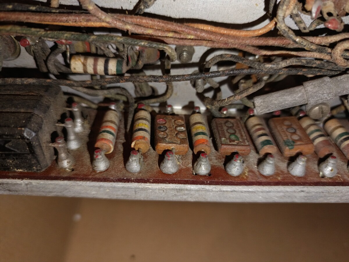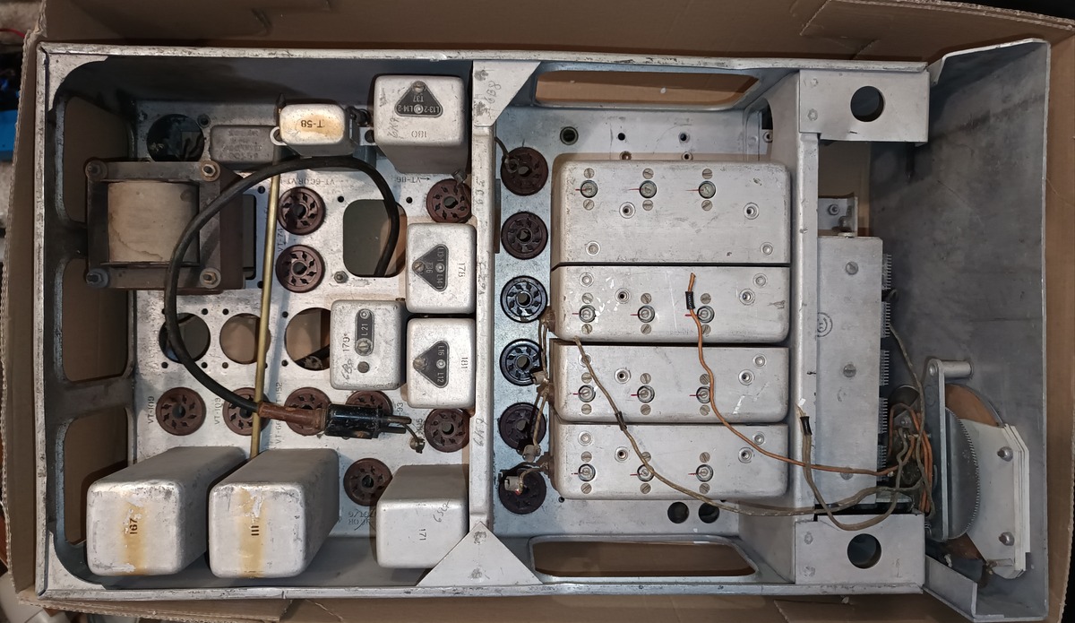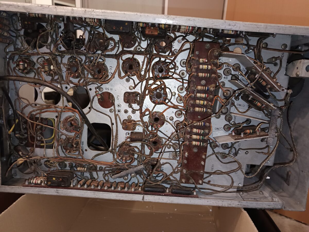 Ich habe hier vermutlich den Empfänger (BC-433) der Radiokompassanlage (SCR-269) die in vielen verschiedenen Flugzeugen der Amerikaner im 2.WK eingebaut war. Schaltplan: https://aafradio.org/docs/SCR-269_schematic.pdf SCR 269: https://www.pool2012.net/make_site/area%20scr269%20radio%20compass/scr269%20radio%20compass.htm Wenn man sich das Gerät anschaut ist es vermutlich umgebaut worden um es mit gewöhnlicher Netzspannung zu betreiben. Man sieht auf den Fotos ein nachträglich eingebauten Trafo und Netzstecker (Wehrmacht). Es wurde außerdem eine komplette Frontblende angefertigt, um die sonst woanders liegenden Bereichsumschalter kompakt in einen Gerät zu haben. Mir stellt sich nun die Frage ob das vor oder nach dem Krieg passierte. Das sieht alles ziemlich ordentlich gemacht aus. Die Zivilbezeichnungen der Militärröhren wurden mit ein Elektroschreiber daneben beschriftet. Gibt es jemanden der mir mehr darüber berichten kann? Wurde sowas früher öfter gemacht? Ich konnte bisher leider nichts feststellen.