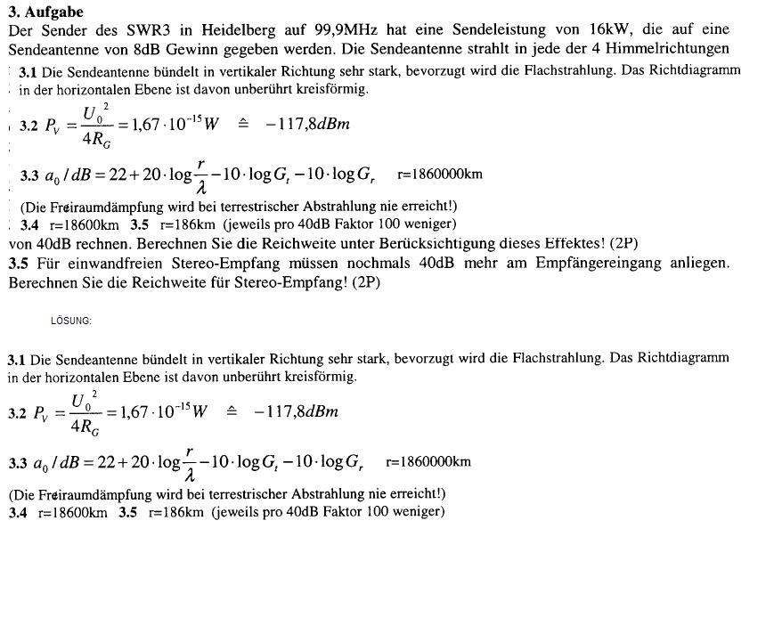 Hi Christoph, ich habs jetzt herausbekommen. 189dB = 22 + 20log(r/lambda) - 10log(Gt) --> nach r umgestellt kommt 1850000km heraus. In dieser Formel habe ich nur den Gewinn vom Sender 8DB eingesetzt. Der vom Emfpänger entfällt ja da ja keine angaben vorhanden sind. Ich hab da noch an Problem mit dieser Aufgabe (siehe Anhang) WIe kommt man auf die Bandvreite 4,33kHz ???? Das ist mir unerklärlich.