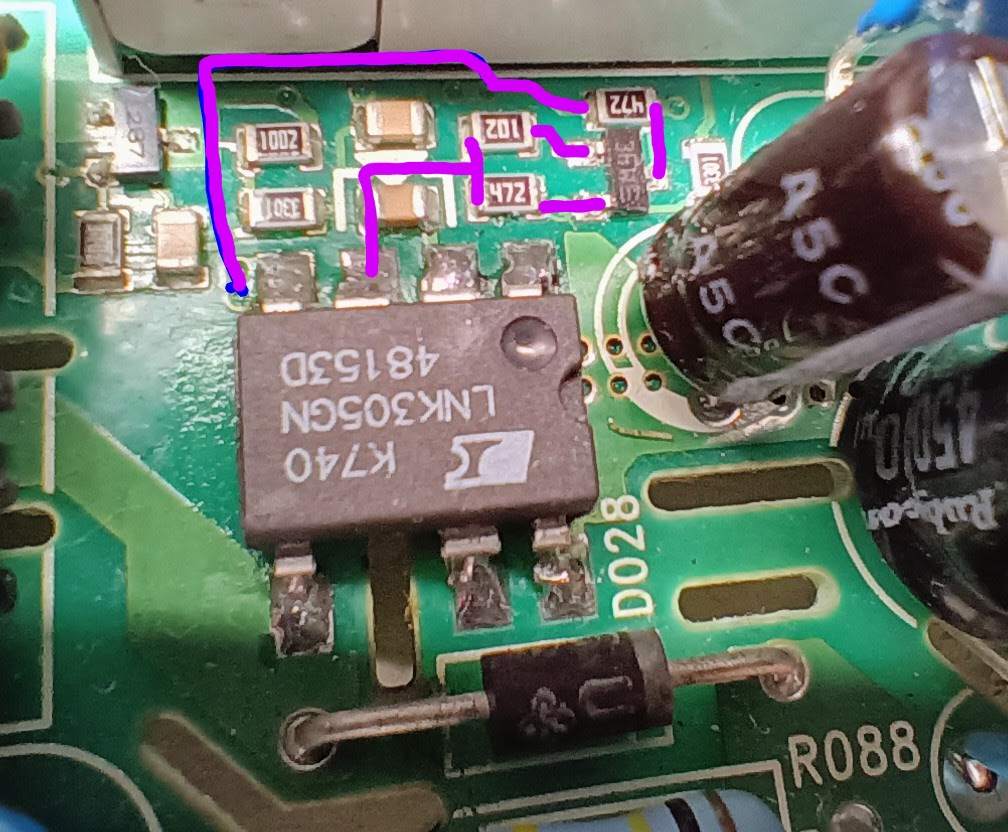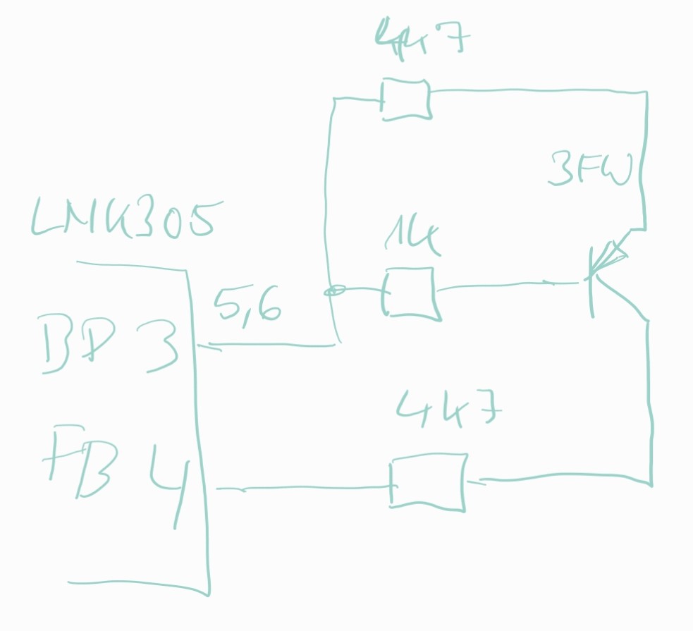 Das Board von einem Bauknecht TK PLUS 71B Di Trockner hatte kaputten LNK305GN und 27Ohm Widerstand. Leider war das nicht alles, es tut sich nichts. 305V DC liegen an, der LNK schaltet periodisch mit ca 65kHz, aber es kommt am FB Pin 4 nichts an. Laut Handbuch soll da was von 1,65V sein. Leider kenne ich mich mit der Topologie nicht aus. Was ich nicht verstehe ist die Schaltung zum FB Pin 4. (Zeichnung) "Sekundär" liegen nur 0,8V an den Elkos an, was vermutlich für die restliche Schaltung zu wenig ist. Eingebaut im Trockner oder alleine auf der Werkbank macht keinen Unterschied. Hat jemand einen Tipp, was die Ursache sein könnte, daß der LNK so läuft und nicht mehr Spannung erzeugt ? Die Vias um den Transistor sind nur Testpunkte auf der Rückseite. Das Ganze ist zweilagig.