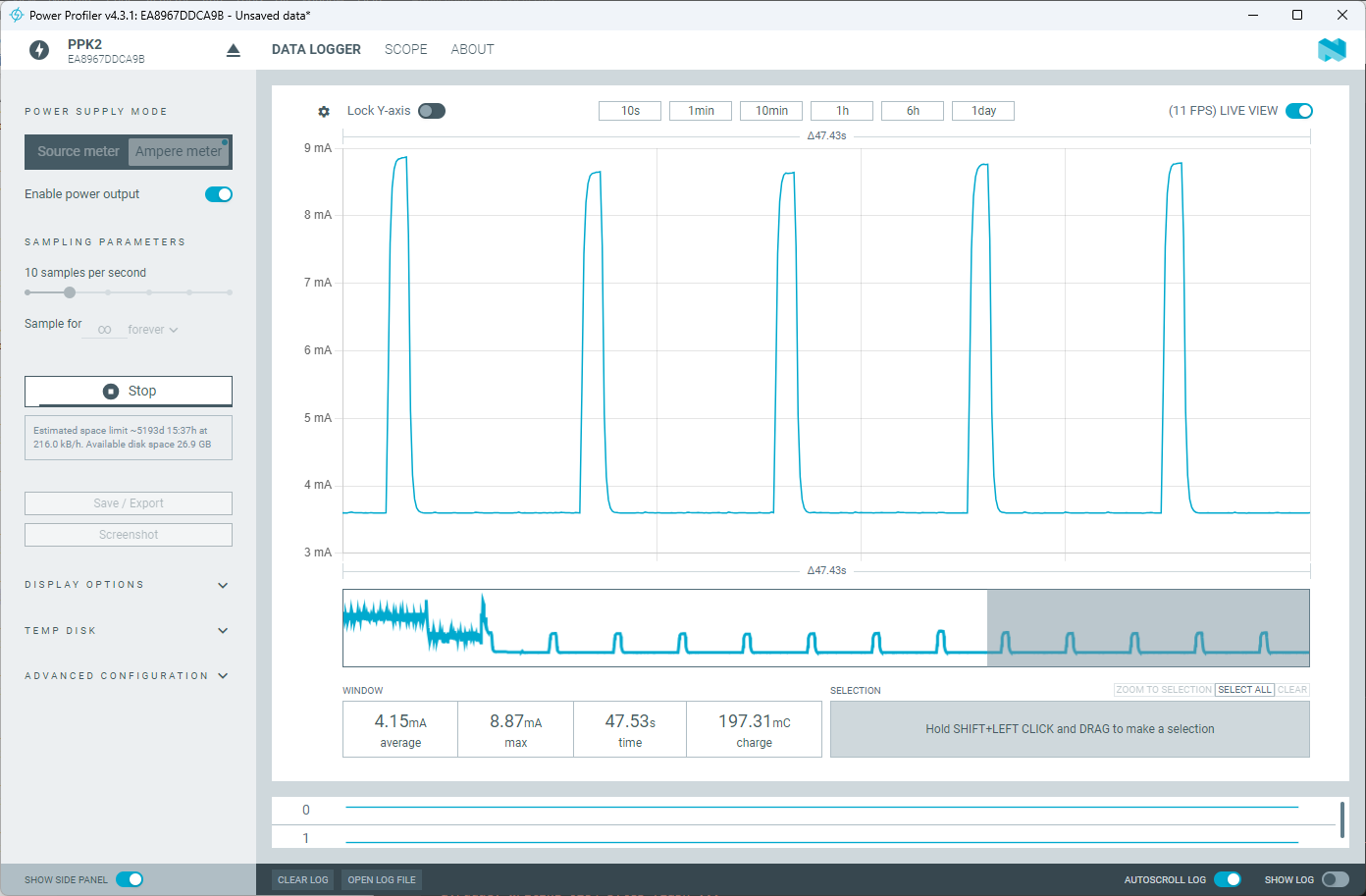 Ich habe jetzt vor das Gerät einen Power Profiler geschaltet um die