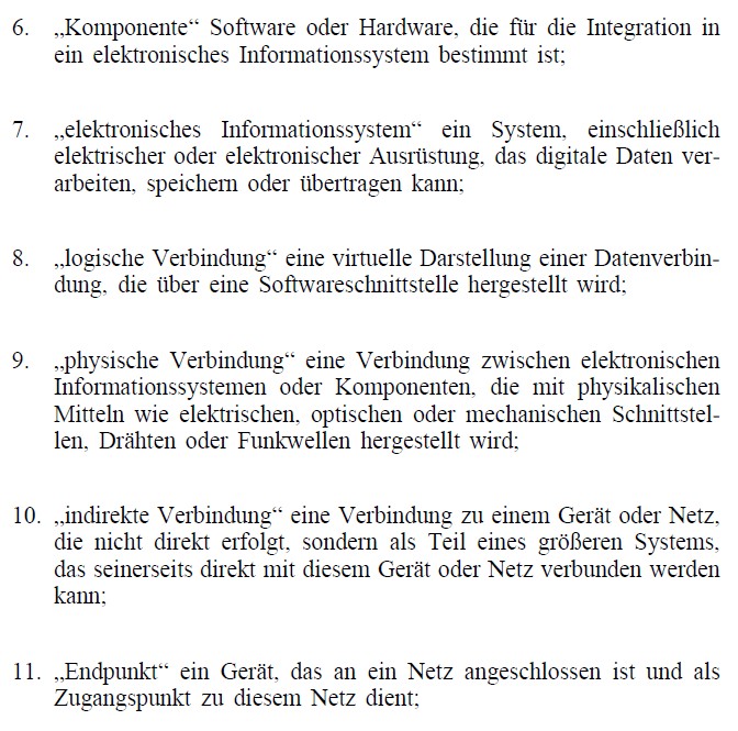 H. H. schrieb: > Wenn es unbedingt falsch verstehen will. Artikel 2 Anwendungsbereich (1) Diese Verordnung gilt für auf dem Markt bereitgestellte Produkte mit digitalen Elementen, deren bestimmungsgemäßer Zweck oder vernünftigerweise vorhersehbare Verwendung eine direkte oder indirekte logische oder physische Datenverbindung mit einem Gerät oder Netz einschließt.