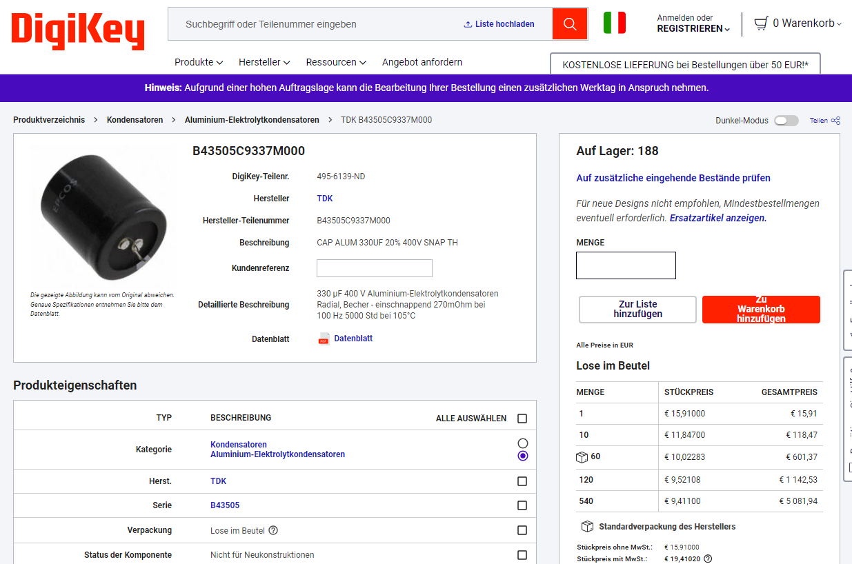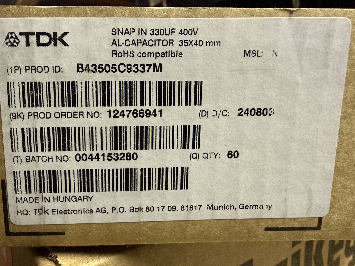 Moin, durch eine Projektänderung verkaufe ich hier hochwertige und nagelneue Elektrolytkondensatoren vom Hersteller TDK/EPCOS. Die Ware wurde erst letzten Monat von DIGIKEY an mich ausgeliefert. Stückpreis bei DIGIKEY rd. 19 Euro (inkl. MwSt). Werte: 330μF/400 Volt Herstellerdatum: 8/24 Genaueres, siehe Bilder! Es sind 60 Stück vorhanden. Stückpreis: 10€ zzgl. Versand. Bei größerer Abnahmemenge können wir gerne über "Rabatt" verhandeln. (Edit: Verkaufs-Tag angebracht. Mod.)
