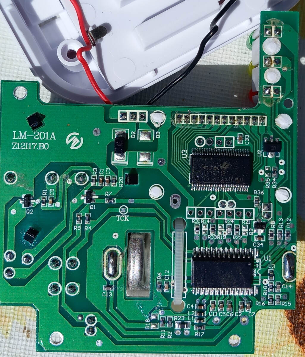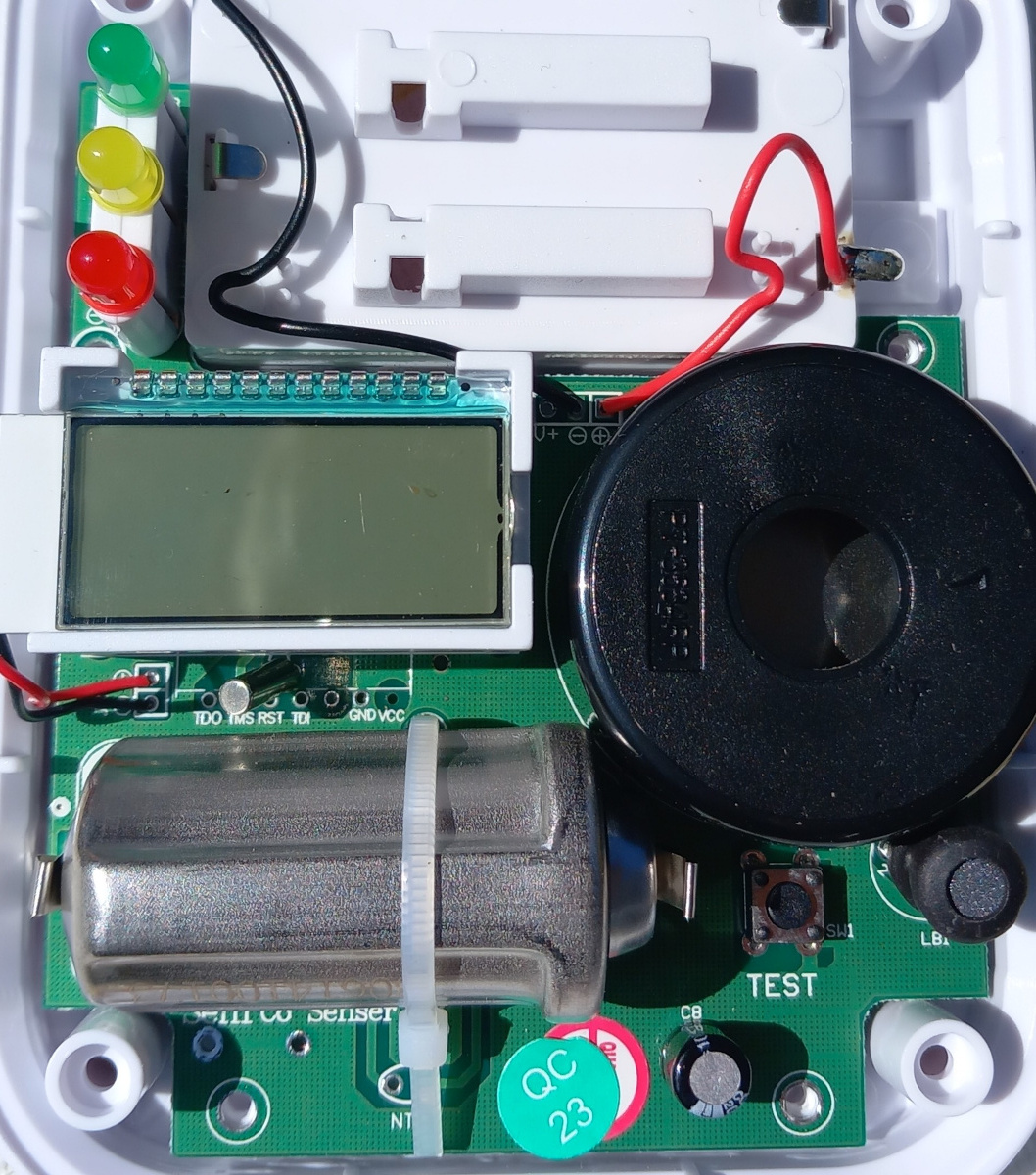 Jemand hat uns einen Kohlenmonoxid-Warner in den Garten geworfen. Die Batterien sind noch gut, das Gerät zeigt auch "Batterie voll" an, aber es piepst alle 22 Sekunden, was wohl der Grund für den Weitwurf war. Dabei leuchtet dann kurz die LED "Fault" und "Alarm" auf. Legt man Batterien ein, leuchten kurz alle LEDs und auf dem Display steht blau hintergrundbeleuchtet "000 PPM", wechselt dann nach 20 Sekunden auf die Temperaturanzeige, dann steht "End" auf dem Display. Dann wechselt es wieder zu Temperatur, End, Temperatur, End, etc .... Der CO-Gehalt wird also nicht mehr angezeigt. Ich sehe zwei Möglichkeiten, entweder ist der CO-Meßteil defekt, der dann übersprungen wird, oder Controller/Programmierung ist hinüber. Der LCD-Controller ist wohl ein HT1621, der andere ist nicht beschriftet. Fragen: Wie lässt sich die CO-Röhre prüfen ? Die Anschlüsse TDO, TMS, RST, TDI weisen auf welches Kommunikationsart hin ? Was für ein Controller ist der unbeschriftete ? P.S. Wenn man den Testknopf einige Sekunden gedrückt hält, dann erscheint auf dem Display "---", "Ph=", "000PPM", "24H", "000" und dann blinkt "PPM" bis "clr" erscheint.