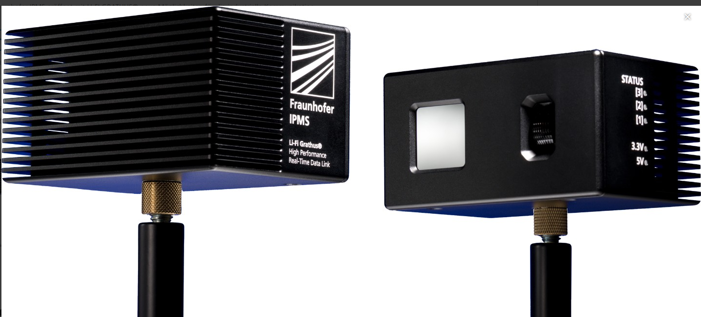 Der Li-Fi Grathus® ist als Evaluierungskit erhältlich. Dieses »Ready-to-Use« Set ermöglicht es, eine kabelgebundene 1Gbps-Ethernet-Verbindung unkompliziert mittels Plug-and-Play durch eine optische Verbindung zu ersetzen und die Grundfunktionen der Technologie in der Praxis zu testen. Ein Kit beinhaltet zwei Grathus® Module, zwei Ethernet Kabel, Stromversorgung sowie ein Benutzerhandbuch und kann direkt über das Fraunhofer IPMS bezogen werden. |
