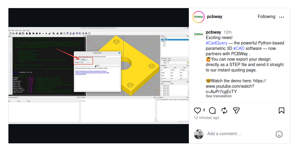 Dass fernöstliche Platinenhersteller ihren Kunden auch als Lohndrehrei, Lohnmodelltischlerei und Co zur Verfügung stehen, ist nicht wirklich neu. Interessant ist, dass man im Hause PCBWay nun -wie in der Abbildung gezeigt - den direkten Export von in CadQuery erzeugten Modellen in das hauseigene 3D-Druck-System erlaubt.